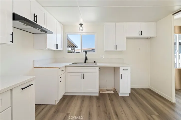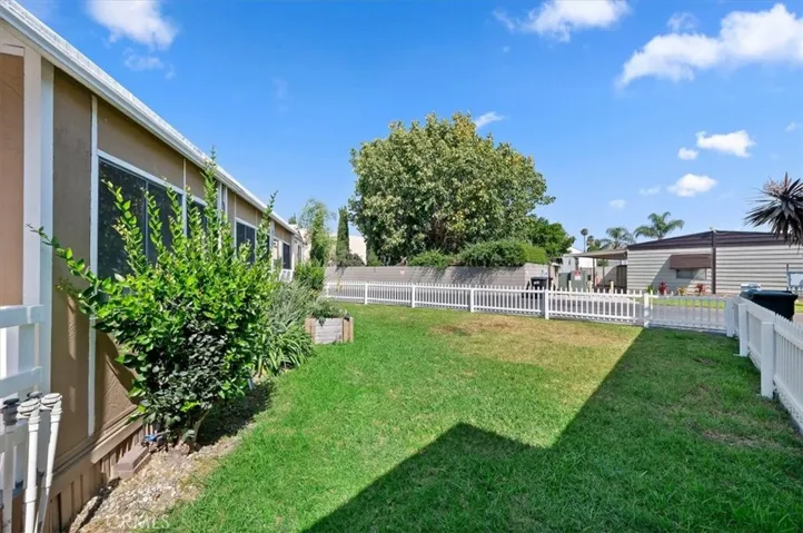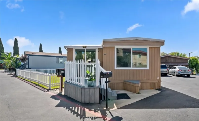 Welcome to the finest home in the highly sought-after Western Skies Mobile Home Park! This 2-bedroom, 1-bathroom residence has been meticulously transformed from top to bottom, offering high-end designer finishes and a modern aesthetic that rivals any new build in Anaheim. Step inside to an open-concept living space flooded with natural light. The vaulted ceilings are accented by striking dark wood beams, creating a perfect contrast against the crisp white walls and contemporary wide-plank flooring. The living room features a custom vertical wood slat accent wall, providing a sophisticated focal point for your entertainment area. The chef-inspired kitchen is a showstopper, featuring bright white shaker-style cabinetry with matte black hardware and elegant quartz countertops and a modern subway tile backsplash. In addition to the two spacious bedrooms, this home features a massive bonus room—perfect for a home office, gym, or second living area. The home also includes the rare convenience of a dedicated separate laundry room, ensuring your chores stay tucked away. While most mobile homes offer little more than a small patio, this property boasts a huge, private grassy yard! Fully fenced with a charming white picket border, it’s the ultimate space for pets, gardening, or weekend BBQs