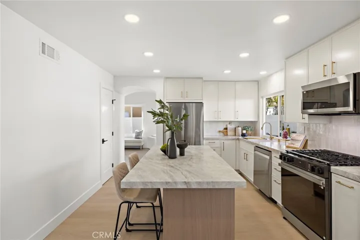 The stunning kitchen is the centerpiece of the home, highlighted by an oversized island, brand-new appliances, stylish lighting, and fresh finishes—perfect for entertaining and everyday living.