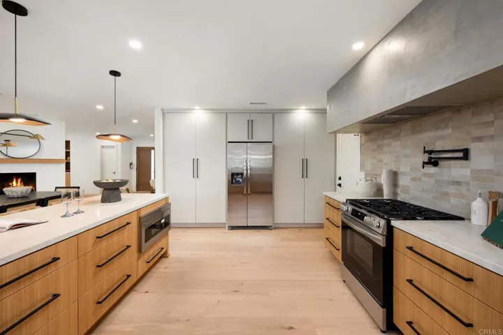 Thoughtfully reimagined from the inside out, this single-story Baldwin Hills residence pairs classic mid-century architecture with curated, contemporary finishes throughout. Wide-plank engineered hardwood flows through an open layout connecting two living spaces, dining room, and kitchen — grounded by two fireplaces. A dedicated dry bar — zellige tile backsplash and wine fridge — carries its own design identity off the living room. The designer kitchen is the home’s centerpiece — two-tone cabinetry pairing white with oak cabinets, quartz countertops, tile backsplash, reeded-base island, pot filler, and stainless appliances. The primary suite offers a slatted wood accent wall, walk-in closet, and spa-inspired bath with a dual floating vanity, marble-look countertops, and a tile shower with rain head and frameless glass enclosure. Additional bedrooms are served by a secondary full bath with a warm wood floating vanity, while the powder room makes a statement with bold graphic-print wallpaper, a floating vanity, and vessel sink. Large sliding doors open to a private backyard with a covered patio, lush lawn, and mature landscaping. Owned solar adds year-round efficiency. Minutes from SoFi Stadium, the Forum, USC, and the energy of Downtown Los Angeles.