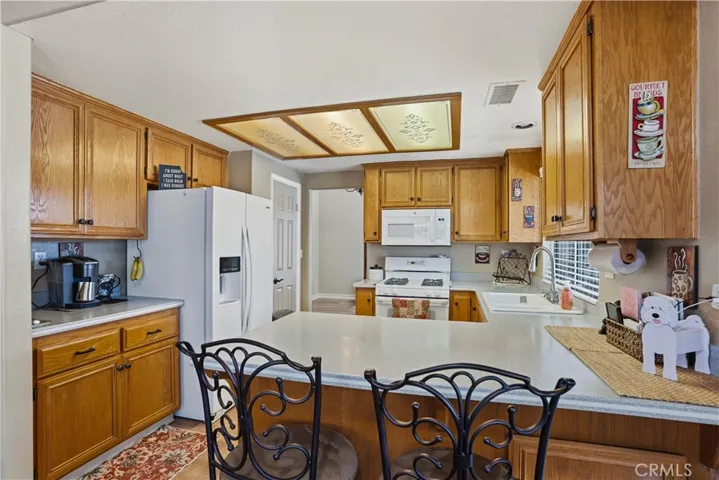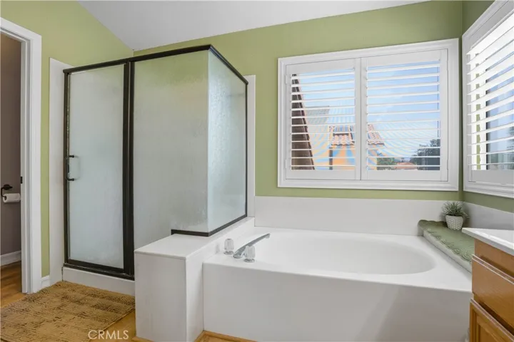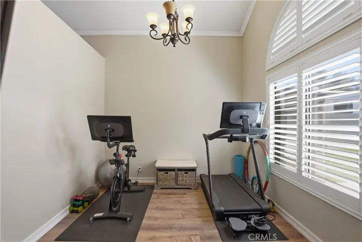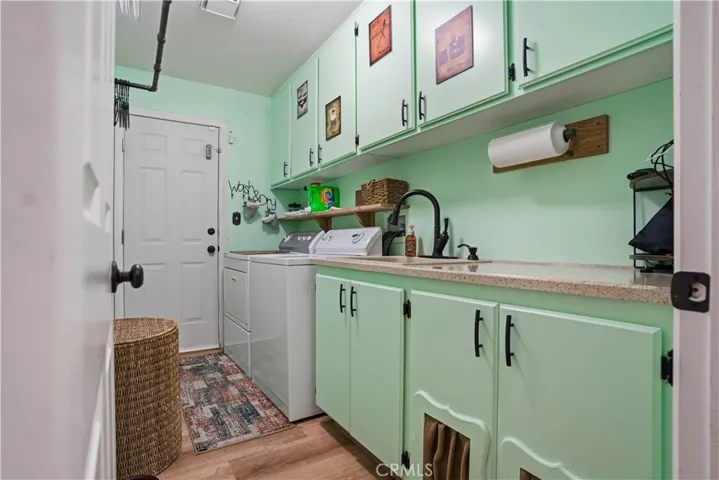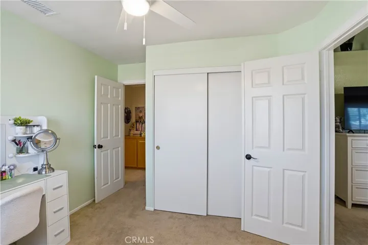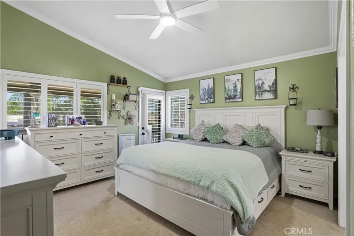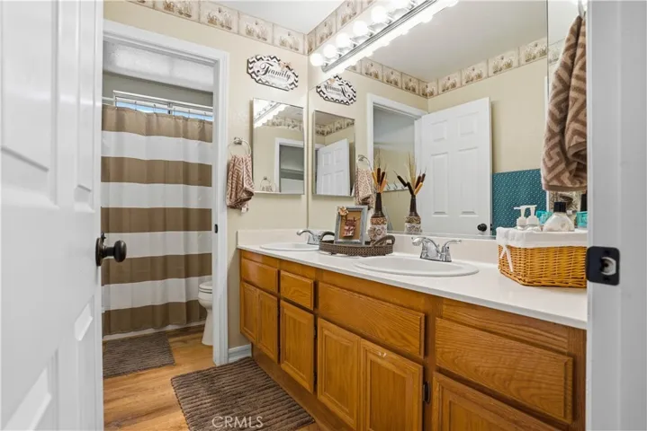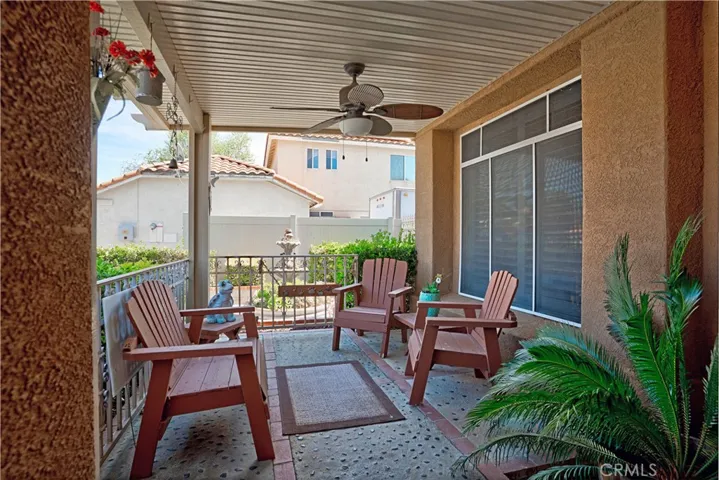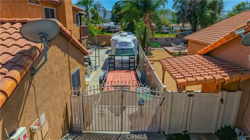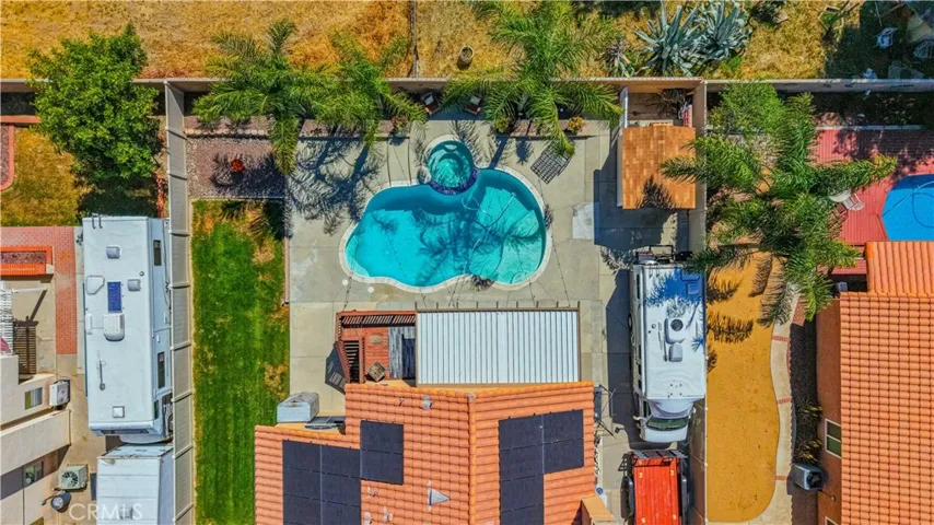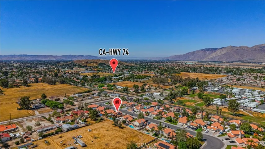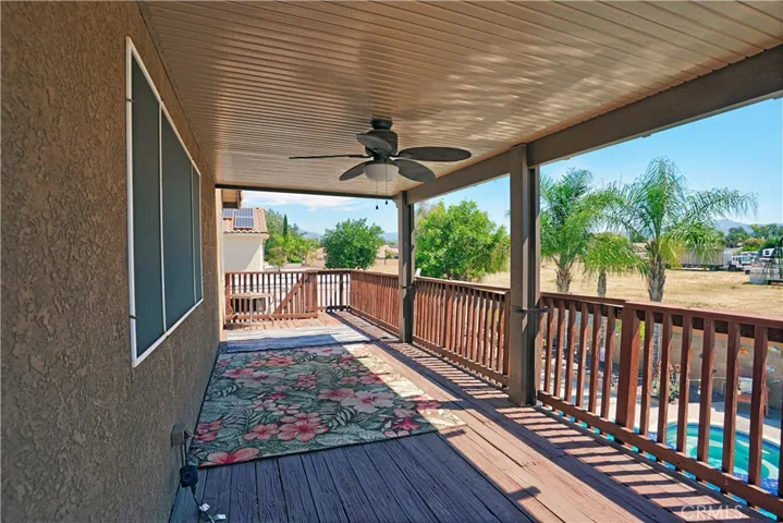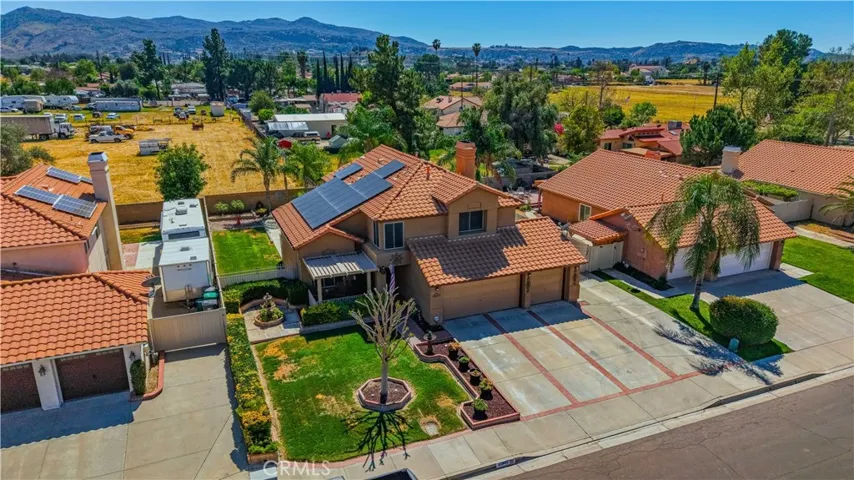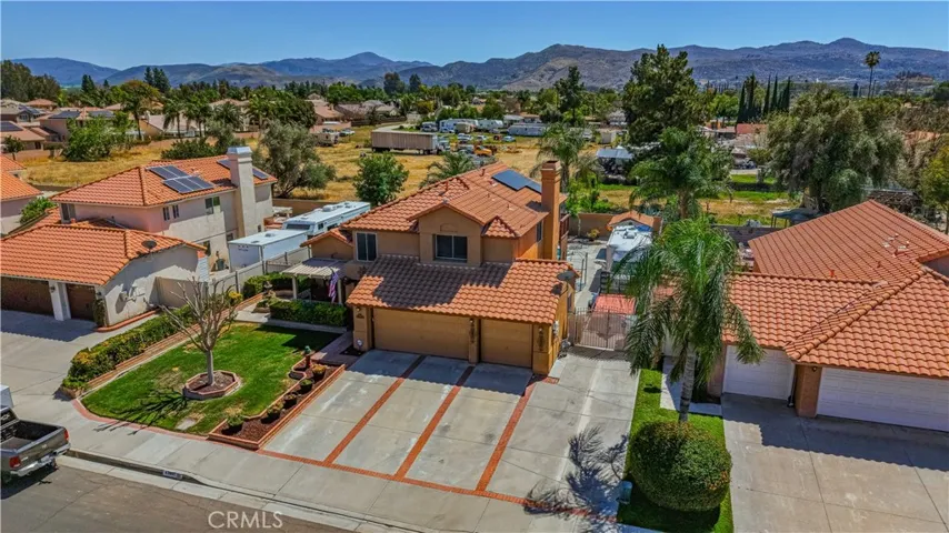 Two Story Hemet Pool Home offering 4 bedrooms, 2.5 bathrooms plus a 3 car garage. Featuring high ceilings as you enter with crown molding, all-new LVP flooring and baseboards complemented by plantation shutters throughout. The spacious layout includes a gas fireplace, downstairs half bath, and a recently updated HVAC system (2022) along with a whole house fan for energy efficiency. Upstairs offers a generous primary suite with a connection to one of the guest bedrooms, plus private access to an upper deck patio with alumawood cover. The primary bathroom features a walk-in closet, separate tub and shower, and dual functionality for comfort and space. All guest bedrooms upstairs include ceiling fans for added convenience. Step outside to a highly private backyard complete with a pool and spa, patio covers, a shed, concrete yard, grass area, sun-blocking screens, vinyl fencing and brick walls. Desirable RV parking pull-through gate access and parking for more along the side. Additional highlights include solar, low taxes, no HOA, and a prime location near shopping, schools, Idyllwild, and Palm Springs.