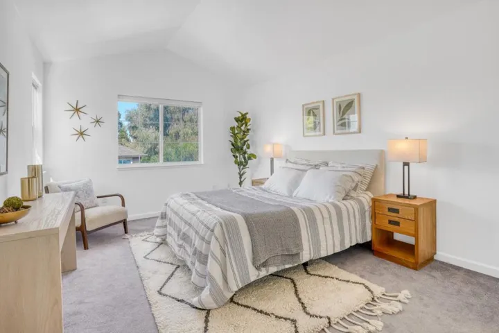 One of the most desirable 2BR 2BA floorplans in Sunnyvale, RARE penthouse-level living with vaulted High ceilings, a private balcony, in-unit laundry, and DIRECT enclosed access to your attached garage, and more. This spacious and bright unit not only shines on its own, but has been thoughtfully upgraded with a contemporary high-end aesthetic. Highlights include sleek kitchen cabinetry with a panel-integrated dishwasher, quartz countertops, newer stainless steel appliances, gas stove w/ range hood, and modern bathroom vanities. Additional improvements include newer light fixtures, vinyl flooring, upgraded carpet, new fireplace tile, and newer water heater, LG washer and dryer. Central air conditioning & heating. Generous storage space, plus multiple walk-in closets. Positioned away from main streets, this unit enjoys a quiet interior setting enhanced by double-pane windows. The well-maintained resort-style Compass Place features lush greenbelts & gardens, a swimming pool, gazebo, playground. Well-funded HOA reserve, no rental restrictions. Conveniently located with easy access to Hwy 101, Lawrence Expressway, Sunnyvale Caltrain Station, and close to many major tech companies. An excellent opportunity for buyers who seeking comfort, convenience, and long-term value.