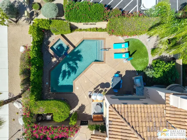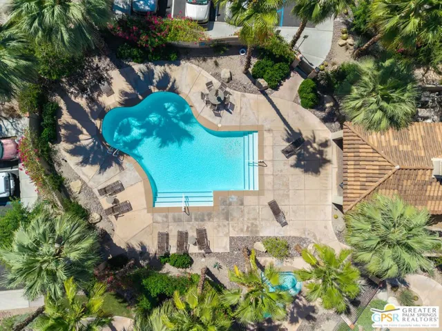 Welcome to this beautifully upgraded corner-unit townhouse in Tierra Hermosa, where modern desert living meets resort-style luxury, just minutes from the vibrant heart of Downtown Palm Springs. From the moment you arrive, this 3-bedroom, 3-bathroom showpiece sets itself apart. Soaring 20-foot ceilings in the living room flood the space with natural light and frame sweeping mountain views, creating a dramatic yet welcoming atmosphere that is truly one of a kind. Updates throughout ensure this home is completely move-in ready. The primary suite is a true retreat, featuring custom built-in cabinetry, a walk-in closet, and a spa-inspired updated bathroom with a luxurious large walk-in shower. Upstairs, a private en-suite bedroom captures stunning mountain views and its own updated bath, perfect for guests or family. An additional downstairs bedroom, and fully updated downstairs bathroom round out the interior with style and function. Step outside and discover what truly sets this home apart, one of the largest private outdoor spaces in the entire community. Entertain in style at your built-in outdoor kitchen complete with BBQ and refrigerator, unwind in your own private saltwater pool and spa, and enjoy the charm of mature lemon and grapefruit trees in your serene, mountain-view backyard. This is Palm Springs outdoor living at its absolute finest. Peace of mind comes standard with a newer HVAC system and water heater, while the attached 2-car garage offers added convenience. HOA dues include cable/internet, water, trash and more. As a resident of Tierra Hermosa, you’ll also enjoy beautifully maintained landscaping, a gated entry, and access to two community pools and spas, because in Palm Springs, every day should feel like a vacation. Experience the best of desert living in this upgraded townhouse perfectly positioned to enjoy everything Palm Springs has to offer.