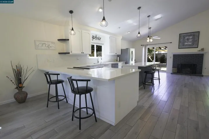 Kitchen remodeled in 2024 with new oven-stove, dishwasher, cabinets and quartz counters. Upgrade porcelain tile throughout the home. Front bedroom is perfect for an office. New hot water heater 2025. Inside and out painted 2024 – 25. Front room-kitchen-sliding glass door news windows this year. Gas starter for wood-burning fire place. Roof about 2014. Lovely back yard. Don’t miss the fruit trees. Or huge covered patio with beautiful pavers and lights. Dryer can be either gas or electric. Circle, so much less traffic, but please watch for kids on bikes. Close to Hwy 99, Costco and so much more. Walking distance to schools. Come see, slow down to rest, and enjoy your new home, inside or out!
