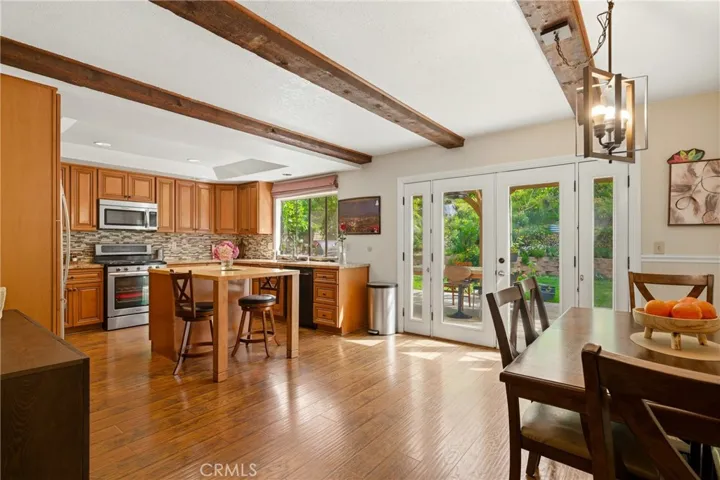 This beautifully maintained home in the heart of Happy Valley, one of Newhall’s most sought-after neighborhoods, perfectly blends architectural character with modern efficiency. The expansive living room makes a grand first impression with open-beam ceilings, a classic brick fireplace, and rich wood flooring. Culinary enthusiasts will love the remodeled chef’s kitchen, featuring granite counters, custom cabinetry, and a versatile butcher-block island/breakfast bar. Seamless indoor-outdoor living is invited through French doors leading to a nature lover’s paradise. The peaceful, private backyard features a lush garden filled with vibrant flowers and fruit trees. Entertain in style at the dedicated barbecue area, tucked under a stunning custom pergola draped in mature grapevines, providing the perfect canopy for alfresco dining and evening relaxation.