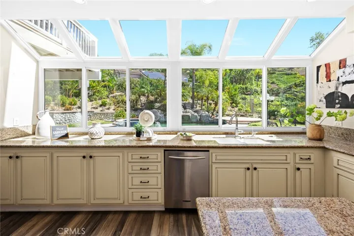 The gourmet kitchen is both stylish and functional, featuring granite countertops, a large center island, walk-in pantry, and expansive windows that flood the space with natural light while framing tranquil views of cascading waterfalls. Open to the kitchen, the inviting family room offers a cozy gas fireplace, custom French doors, and direct access to the backyard—perfect for effortless indoor-outdoor living.