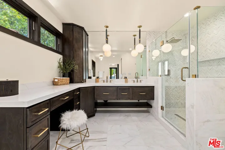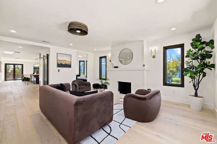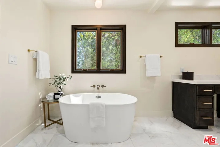 Restored 1920s Spanish Revival in the heart of Silver Lake with iconic Hollywood Sign views. This thoughtfully preserved home blends historic character with modern sophistication – crisp white stucco, red barrel tile roof, and clean architectural lines that embody timeless California style. Curved entryway wall adds architectural drama, while dark-framed windows and matching wall sconces lend a sophisticated contemporary contrast to the classic facade. Concrete steps with sleek black iron railings lead to a welcoming entry deck, perfect for soaking up the Southern California sunshine. Inside, an open-concept layout floods with natural light, showcasing wide-plank floors, designer lighting, and seamless flow between living, dining, and kitchen. The chef’s kitchen anchors the space with high-end stainless appliances, custom cabinetry, and an oversized island with seating ideal for everyday living and entertaining. The primary bath is a true sanctuary. A freestanding soaking tub and L-shaped double vanity feature dark cabinetry and brass hardware for a rich, designer feel. The walk-in shower impresses with herringbone marble tile, frameless glass, and brass fixtures for a hotel-worthy finish. Wide-format marble floors, custom tower cabinetry, and warm natural light complete the space. The indoor-outdoor lifestyle shines with multiple access points to a private backyard, perfect for al fresco dining and lounging under the Southern California sun. Nestled in a verdant, palm-lined neighborhood with glimpses of tropical canopy, this is a rare opportunity to own a restored 1920s Spanish Revival in one of LA’s most sought-after neighborhoods, minutes from top dining, shops, and culture.