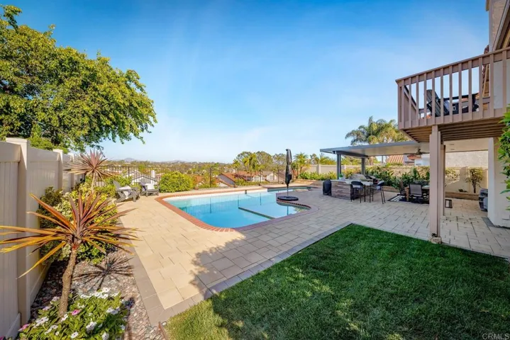 Step into a refined sense of comfort and privacy with this beautifully appointed two-story home, ideally situated in the heart of Encinitas, CA. Tucked away on a quiet cul-de-sac and set on a generous lot just under 10,000 square feet, this residence offers both space and serenity. Originally built in 1986 and thoughtfully expanded to 2,336 square feet, the home features four well-proportioned bedrooms and tastefully remodeled bathrooms, creating a flexible layout suited for both everyday living and hosting. With no neighbors in front and clear views to the east in the backyard, the setting feels peaceful and secluded. From the moment you enter, the home welcomes you with a sense of warmth and quality. At its center is a fully reimagined kitchen designed for both functionality and style. Outfitted with premium Wolf appliances including a gas range, oven, and microwave, along with a Sub-Zero refrigerator, this space is ideal for culinary enthusiasts. Quartz countertops, a designer backsplash, and custom Bellmont cabinetry complete the space with a clean, modern finish. The adjoining living area features engineered hardwood flooring and a slate tile fireplace, complemented by an Indonesian Rosewood mantle. A custom-built bar crafted from a Zinfandel barrel sourced from Powell Mountain Cellars adds a distinctive and inviting touch. Vaulted ceilings and Plantation shutters enhance the sense of openness while maintaining privacy. An additional downstairs bedroom can be used as an office or den with a full bath in the hall. The private primary suite offers a serene and thoughtfully designed retreat, enhanced by brand new carpet, tile flooring and an abundance of natural light. The spa inspired ensuite features dual vanity sinks, a spacious walk-in closet, and a separate soaking tub and shower, creating a perfect balance of comfort and functionality for everyday living. The secondary bedrooms are generously sized and enjoy soft east facing views, bringing in beautiful morning light. Each room is equipped with new carpet and ceiling fans with remote controls for added convenience. The guest bathroom is equally well appointed, featuring dual vanity sinks and a combination tub and shower with a sleek glass enclosure, providing both style and practicality for family and visitors. A spacious east facing bonus room opens to a private balcony finished with durable TREX decking, offering a peaceful setting to enjoy morning light and views of the backyard and pool. The outdoor space has been carefully upgraded to support both relaxation and entertaining. Features include new vinyl fencing, Belgard pavers, and a large covered Alumawood patio cover. The outdoor kitchen area is equipped with a Lynx grill, refrigerator, Yoder smoker, and granite countertops, making it ideal for gatherings. The pool and spa provide a refreshing retreat, supported by a newly installed Pentair Superflo VS pump in 2025. Additional improvements throughout the home include updated PEX plumbing, a new gas water heater, Milgard windows for improved energy efficiency, and a high-performance skylight in the primary bedroom with remote operation. A whole house fan offers an efficient way to keep the upstairs cool and comfortable. With a two-car garage offering ample storage and a location just minutes from Encinitas beaches, dining, award winning schools and community amenities, this home presents a rare opportunity to enjoy comfort, privacy, and coastal convenience in one of North County’s most sought-after areas.