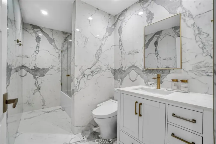Chandler Park Village!!! Unit #207 Exquisitely remodeled 3-bedroom, 2.5-bathroom condo that exudes sophisticated modern living in the heart of Sherman Oaks. No expense was spared in transforming this residence into a designer showcase, combining elegance, smart technology, and luxurious finishes throughout. From the moment you step inside, you’re greeted by sleek European oak floors, elegant recessed lighting, and a thoughtfully designed open floor plan perfect for entertaining. The living area is anchored by a cozy modern fireplace and accent wall, complemented by private balcony that fills the home with natural light. The custom chef’s kitchen is a true masterpiece, boasting high-end Quartzite Cristallo countertops, sleek dual-tone cabinetry, soft-close drawers, and top-of-the-line smart appliances. Whether you’re preparing a quick meal or hosting a dinner party, this kitchen is equipped to impress even the most discerning chef. All bathrooms feature custom vanities, Quartzite Cristallo countertops, designer lighting, and luxury wall-to-wall imported tile. The spa-like primary bath includes a walk-in Steam shower with rainfall fixtures and gold hardware that adds a touch of glamor to every morning routine.