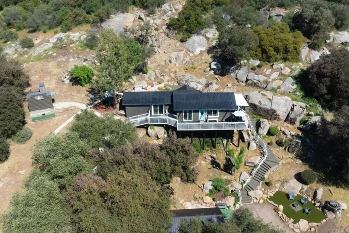 Charming and thoughtfully updated Descanso property tucked away on a quiet street, just a short walk to the elementary school. This unique property features a beautifully refreshed main home (approx. 750 sq ft) plus a detached studio (approx. 200 sq ft), offering flexible living space, guest potential, or a private work-from-home setup. The main home has been extensively updated, including an upgraded kitchen with newer appliances, updated laminate flooring, and fresh interior and exterior paint. The bathroom has been fully refreshed with new flooring, vanity, and fixtures, while the bedrooms feature recent improvements including new windows, sliding door access, ceiling fan, and modular wardrobe. Cozy up by the upgraded wood-burning stove or enjoy the added functionality of the laundry/utility area with stainless steel sink and all-in-one washer and dryer. Step outside to a wrap-around deck with updated wood and pillars, perfect for enjoying the peaceful surroundings. The property has also been improved with graded driveway access, concrete walkways, and recently pruned trees for a clean, open feel. The detached studio has been updated with a metal roof, new windows, and porcelain flooring—just awaiting final touches to the shower to complete the space. Additional features include a metal roof on the main home and a refreshed shed with newer roof and siding. A great opportunity to own a move-in ready home with added versatility in the heart of Descanso.