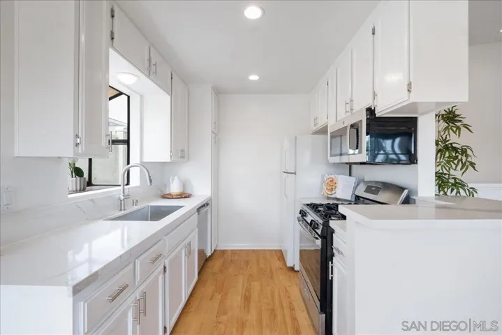 Experience the best of Pacific Beach living in this ideally located end-unit condo within walking distance to the beach, Mission Bay, & Kate Sessions Park. From beach sunsets & bayfront bike rides to the dining, shopping, & energy of Garnet Avenue and Mission Boulevard, everything you love about coastal San Diego is right at your doorstep. This thoughtfully designed split-level layout offers a rare level of flexibility. The entry level features a bedroom & full bathroom—ideal for guests, a home office, or additional living space with direct access from the attached garage for added convenience. Upstairs, vaulted ceilings & recessed lighting create a bright, open feel throughout the main living area, which flows seamlessly to a private balcony—perfect for enjoying coastal breezes. The updated kitchen features quartz countertops, modern finishes, & stainless-steel appliances, blending style with everyday functionality. The upstairs primary suite offers a spacious & comfortable retreat, enhanced by vaulted ceilings, recessed lighting, & an open, airy feel. Additional highlights include in-unit washer/dryer, end-unit positioning, & a rare parking setup with an attached one-car garage plus a flexible two-car driveway with one full size & space for a compact vehicle. The garage also provides valuable extra storage space for bikes, surfboards, & beach gear. Set within a small community of just seven units located on a cul-de-sac street, this home offers a low-density feel while remaining close to it all. Enjoy easy access to Mission Bay, the beach, Kate Sessions Park, & local Pacific Beach favorites, along with convenient proximity to the Rose Creek wetlands, downtown San Diego, the San Diego Zoo, University of California, San Diego, University of San Diego, San Diego State University & Fashion Valley Mall.