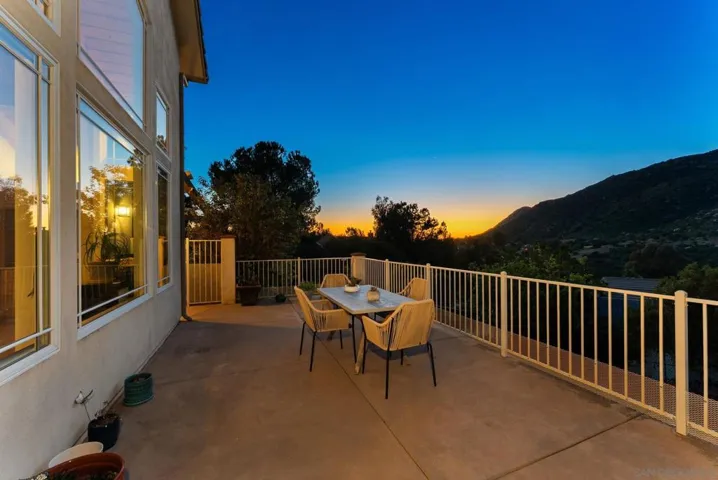 Resort style, single story, custom built home at the end of a private cul-de-sac with mountain views, owned solar with back up batteries in a well established community! 4-bedroom, 3 full bath home plus an office/library off the formal entry hall. Dramatic wood cross-beam ceilings, soaring picture windows with expansive views and a raised-hearth stone fireplace with blower, built-in shelving, and seamless flow to the kitchen and dining areas. Hardwood and tile flooring throughout. Chef inspired kitchen with granite countertops, wine fridge, Bosch fridge, island with sink and two refrigerated drawers, 6-burner gas range, built-in desk, & walk-in pantry. Formal dining room overlooks the outdoor kitchen, large patio, and mountain views. Spacious primary suite with plush carpeting, private covered patio access, and an en-suite bath featuring dual vanities, soaking tub, large walk-in shower, and ample storage. Two secondary bedrooms include built-in desks and share a Jack-and-Jill bath. Guest bedroom sits near a full hall bath with access to the laundry room with extra cabinetry and counter space. Enjoy the private solar-heated pool and spa, outdoor kitchen with Viking gas grill & cooktop, sink, skylit wood ceiling and multiple view terraces and entertaining patios. Outdoor spaces include a front-facing terrace off the great room, grass area below the pool, and a private pool terrace with storage shed, elevated waterfall spa, and wraparound patios ideal for stargazing. Gated side driveway offers RV parking and RV hookups and storage. Mature landscaping includes apricot, plum, Meyer lemon, Bearss lime, navel orange, bay laurel, key lime, Mexican lime, and chardonnay grapevines. Additional features: whole house filtration system, new AC, ceiling fans, skylights, dual-pane windows, owned solar with 3 back up batteries. Located within San Diego Country Estates, a master-planned community known for its resort-style amenities and scenic backcountry setting. Residents enjoy access to an award-winning golf course, equestrian centers, pools, parks, and miles of hiking, biking, and riding trails, along with a strong sense of community and year-round events.