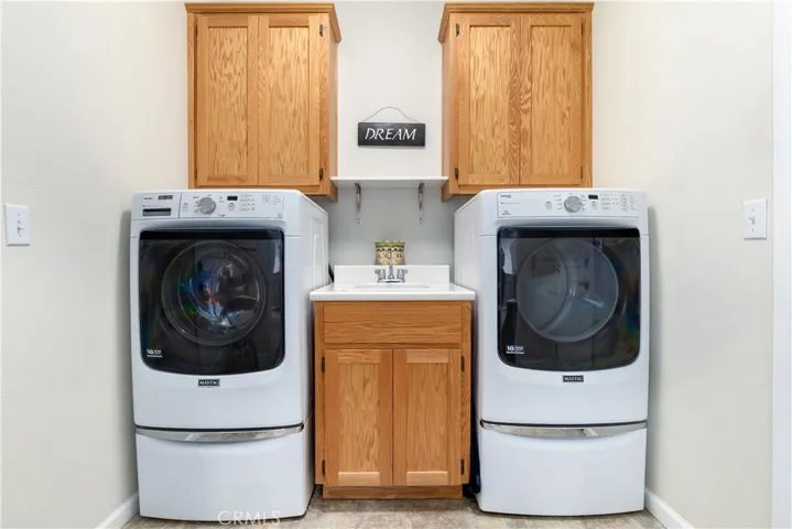 home, ideally situated on a quiet cul-de-sac in the highly desirable Heritage Ranch community. With open space above the home and a peaceful greenbelt behind, this property offers a rare combination of privacy and scenic surroundings. Upon entering the home, the open-concept floor plan allows for each room to flow together however rustic charm and details highlights the home where vaulted ceilings create a bright, and airy feel. The living room is anchored by a stunning rock fireplace with a floating mantle, adding warmth and character—perfect for cozy evenings. Nine-foot ceilings extend throughout the rest of the home, enhancing the sense of space. The kitchen is designed for both function and style, featuring granite countertops, stainless steel appliances, ample cabinetry, & a versatile movable island. The kitchen flows seamlessly into the dining area. Just off the kitchen, you’ll find a convenient indoor laundry room complete with a sink and additional storage. Down the hall, tile flooring transitions into cozy carpeted bedrooms. The nice sized primary bedroom tastefully designed with a walk-in closet accented by a custom sliding barn door ensuite bathroom is its own mini oasis equipped with soaking tub, private stand alone shower, & water closet, Second and third bedroom are comfortably sized with adequate closet space, ideal for guests, family, or a home office. Moving towards the outside of the property pride of ownership truly shines. Thoughtfully designed rock landscaping pairs beautifully with clean concrete hardscaping adding longevity and ease of use with a charming wraparound porch. You will find a pathway leading to a newly developed upper deck & lounge area. The expansive driveway and oversized, extra-deep 3-car garage Additional features include a durable concrete tile roof, owned solar, water filter system and fire sprinkler system for added peace of mind. This property is conveniently located walking distance to Oak Hill Market, Cappy Culver (K- 8), Restaurants, Gas, Gym, Hairitage Salon and a mile from the launch ramp. Heritage Ranch has community events, with access to a private marina and boat launch, two pools, sport and pickleball courts, scenic trails, parks, playgrounds, an equestrian center, & as a 24-hour gated attendant. It’s country living with all the conveniences of the city.
