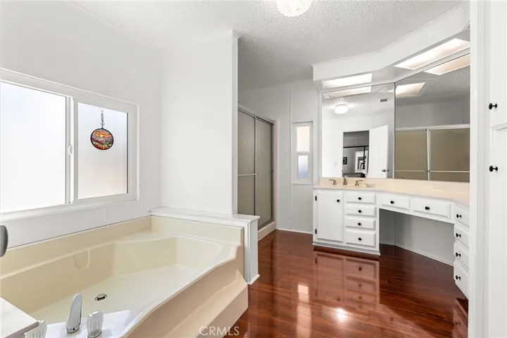 Welcome to The Lakes at Hemet West, an Active 55+ community! This well maintained TRIPLE-WIDE home offers space, character, and thoughtful upgrades throughout. Step inside to cathedral ceilings with exposed wood beams, a tile entry, and rich dark wood laminate flooring. The layout features both a formal living room and a separate family room with a wood-burning fireplace, custom rock surround, raised hearth, and wood mantle, perfect for relaxing or entertaining. The kitchen is filled with natural light and includes laminate countertops, tile backsplash, breakfast nook, pantry, and updated black hardware. A built-in hutch anchors the dining area, while the family room offers a built-in bar with sink, cabinetry, lighting, and outlets. This home offers 2 bedrooms and 2 full baths. The primary suite features a walk-in closet, dual sinks, vanity area, separate tub and shower, and linen storage. Additional highlights include mirrored closet doors, a dedicated office space with built-in desk and cabinetry, and an indoor laundry room with ample storage. Recent upgrades include dual-pane windows, updated electrical breakers, new support bracing, blinds, and newer carpet in the formal living room. All appliances are included, including washer and dryer. Outside, enjoy a covered carport and storage shed. Community amenities include Golf, pool, spa, pickleball, horseshoes, clubhouse, library, and so much more offering an active and welcoming lifestyle. Schedule a tour today!