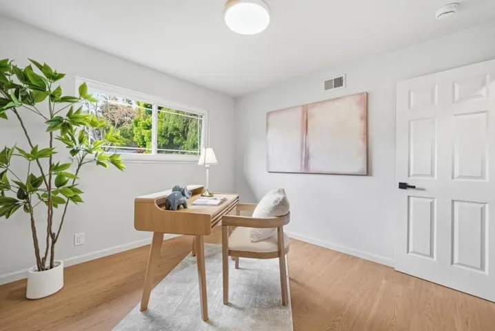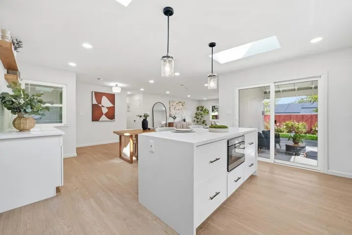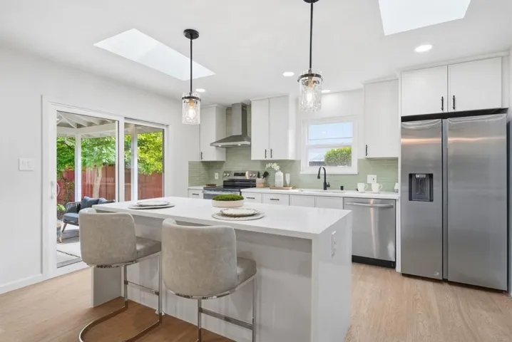 Beautifully updated single-story home featuring 4 bedrooms, 2 bathrooms, and approximately 1,389 sqft of thoughtfully designed living space. The bright and open-concept layout is filled with natural light, with a welcoming living room that flows seamlessly into the dining area and a fully remodeled kitchen. The kitchen showcases a large center island, quartz countertops, stainless steel appliances, skylights, and stylish cabinetryperfect for both everyday living and entertaining. Well-proportioned bedrooms offer comfort and flexibility, while the updated bathrooms feature clean, modern finishes. Wide-plank flooring, recessed lighting, and fresh interior updates create a cohesive and airy feel throughout. Step outside to a spacious backyard with a covered patio, ideal for outdoor dining, relaxing, or hosting gatherings, with ample space for gardening or future possibilities. Additional highlights include an attached two-car garage and a peaceful, established neighborhood setting. Conveniently located near major tech campuses, parks, shopping, and key commute routes, this move-in ready home offers the perfect blend of comfort, style, and everyday convenience.