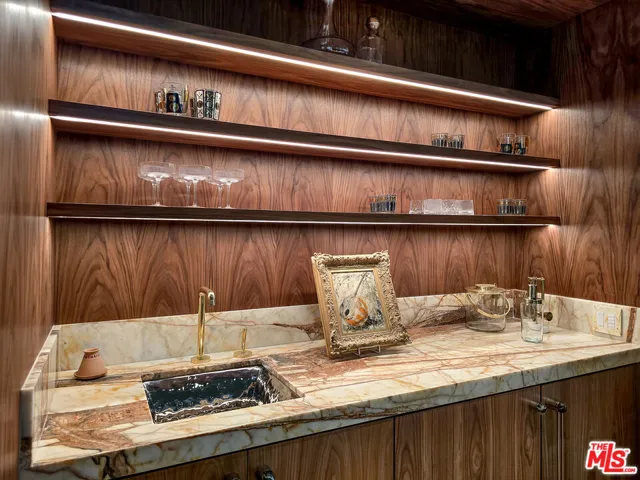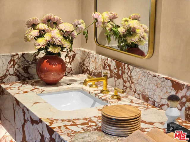 Perched on a corner lot of a serene knoll in the heart of Beverly Hills’ coveted Coldwater Canyon, this exquisitely just remodeled single-story Contemporary estate is a newly completed design masterpiece by renowned designer Nina Takesh. Spanning over 2,900 square feet, this four-bedroom, five-bathroom residence redefines bespoke luxury, blending refined sophistication with effortless California living. From the moment you enter through Pinky’s custom iron doors, it’s clear no expense was spared. The home features engineered herringbone wood floors, Roman Clay walls by Portola, and custom finishes at every turn. The entire property is outfitted in real marble, lending timeless elegance and material integrity throughout. The formal entry, accented by a coved ceiling and sculptural plaster chandelier by Visual Comfort, opens into an oversized, step-down family room that connects seamlessly to a designer bar and dining area. The bar features a rare, hand-hammered polished steel sink by Mick De Giulio for Kallistaone of many exceptional selections, as every plumbing fixture in the home is exclusively from the luxury brand Kallista. The formal living room is centered around a one-of-a-kind fireplace clad in dramatic Rosso Levanto marble and opens to the expansive backyard through three sets of glass doors. The chef’s kitchen is a study in both beauty and functionality, with a central island, breakfast bar, top-tier Jenn Air appliances, Calacatta marble backsplash, and flawless flow. All four bedrooms are en suite, including the luxurious primary suite with a walk-in closet and private access to the backyard. Every bathroom features custom glass shower doors inset with a mix of polished nickel and brass, adding a tailored, jewel-box quality to the spaces. Outside, the newly redone resort-style pool, built-in BBQ station with refrigerator, al fresco dining area, and lush landscaping creates a true entertainer’s paradise. There’s even a dedicated dog run for your four-legged guests. Lighting has been curated down to the last detail: all decorative fixtures are by Visual Comfort, and the recessed lighting is powered by Elemis, Visual Comfort’s most advanced home lighting solution. A state-of-the-art home automation system ensures effortless control of lighting, climate, and entertainment. Additional highlights include elegant wainscoting throughout and premium architectural hardware from the luxury Australian brand Bankston. Just minutes from the legendary Beverly Hills Hotel and the world’s most coveted shopping and dining on Rodeo Drive, this top-of-the-line residence offers an extraordinary level of design, customization, and comfort designed for the most discerning buyer.