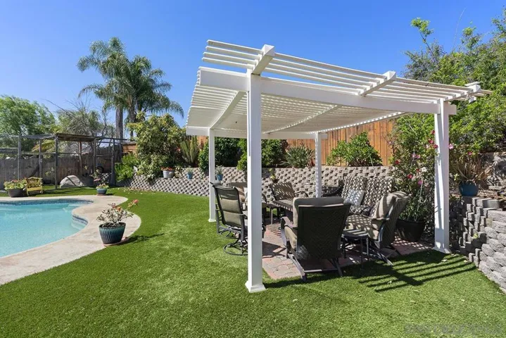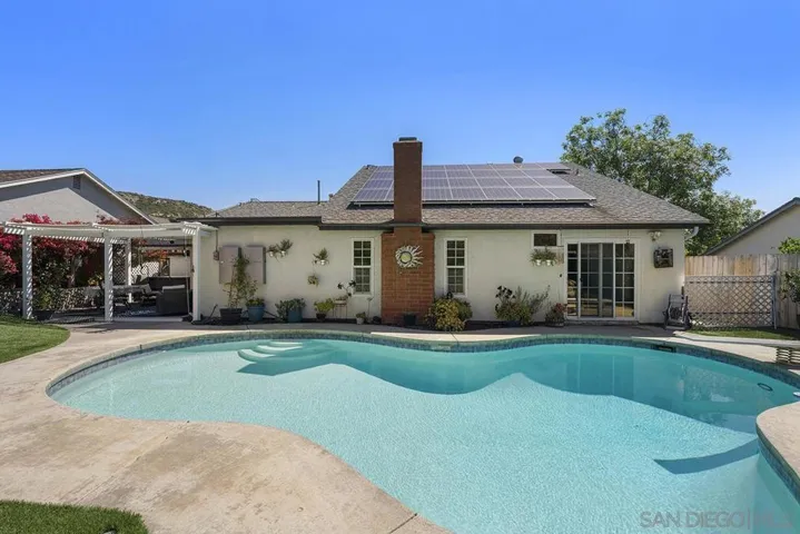 4 bedrooms and a full 3 baths. Quiet street. Move in ready home with a pool and an above ground spa. Two rooms could be primary. One downstairs and one large one upstairs (this was 2 rooms when it was built, now one large mster bedroom, the only room upstairs). Huge vaulted ceilings in the living room give this is grand feel. 49 solar panels and a new solar battery system. see attached. Recent SDGE bill was 23.00. Floor plan is in the pictures. Garage door is still on the front of this garage. Garage is partially converted to a family room. This is the room with the large TV in the pics. This is not permitted. This garage conversion is not part of the square footed listed in MLS. Garage has a few feet deep of storage. New owner could opt to remove one wall and turn this back into a garage.