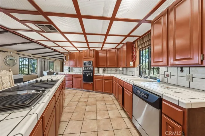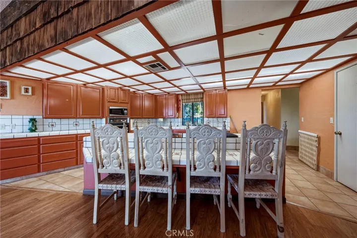 Step inside to discover warm custom woodwork, wood-laminate flooring, and abundant natural light. The inviting living room showcases a built-in fireplace, kerosene monitor heater, ceiling fan, and elegant wood beams. The spacious kitchen is a cook’s delight with a central island featuring an electric glass cooktop and indoor griddle, tiled countertops and flooring, a pantry, dual sink, oven, microwave, and generous cabinet space. The adjoining dining area offers easy access to the back deck through sliding glass doors.