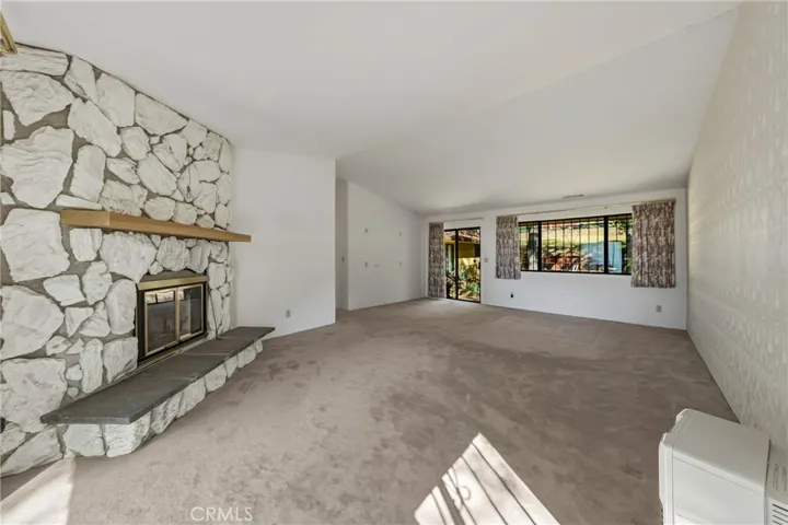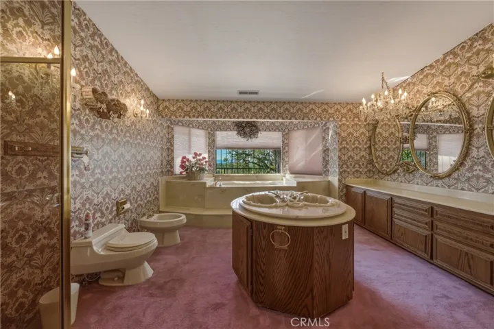 The primary suite is a true sanctuary, featuring vaulted ceilings, a walk-in closet with custom shelving, fireplace, monitor heater, and two sliding doors opening to both the front and back patios. The luxurious ensuite bathroom includes dual island sinks, two toilets, a deep soaking tub, walk-in shower, and an expansive vanity with built-in storage.