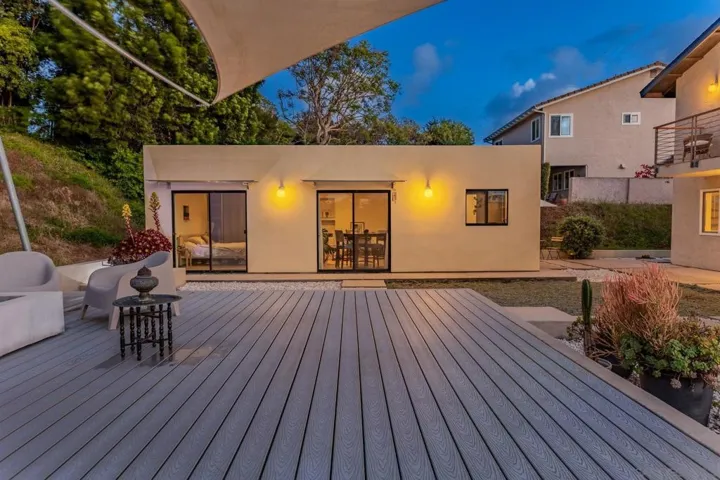 One-of-a-kind modern retreat in the heart of Old La Costa with a detached ADU and resort-style grounds on an expansive .26 acre lot. Set within one of North County’s most sought-after neighborhoods known for its custom and eclectic homes, this architecturally distinct residence offers a rare blend of design, functionality, and flexibility. Inside, curated upgrades create a sleek, contemporary feel, including a striking concrete surround fireplace, bamboo cabinetry, frosted glass accents, and granite flooring throughout. The home’s design is centered around seamless indoor-outdoor living, highlighted by a dramatic architectural archway that opens to a private backyard retreat. The outdoor space is built for entertaining, featuring resort-style grounds and an expansive raised platform patio-perfect for hosting or enjoying quiet evenings at home. This thoughtfully designed home features four bedrooms upstairs, including a spacious primary retreat with westerly-facing peek-a-boo ocean views. Tastefully updated throughout, it offers a clean, modern aesthetic that feels both fresh and inviting. Downstairs, enjoy a dedicated office space and two separate living areas, providing flexibility for work and everyday living. A true standout feature is the approximately 500 sq ft detached ADU, complete with a kitchenette, full bathroom, living area, and private bedroom, offering ideal space for guests, multigenerational living, or potential rental income. Ideally located just minutes from shopping, dining, and North County’s renowned beaches, this property presents a rare opportunity to own a truly distinctive home in Old La Costa.