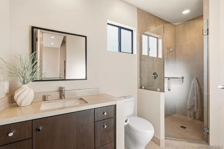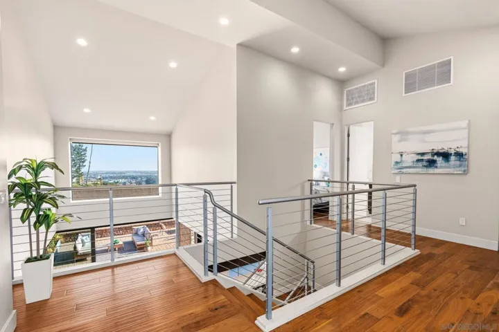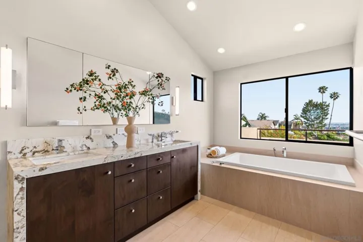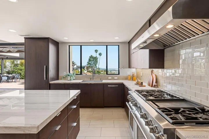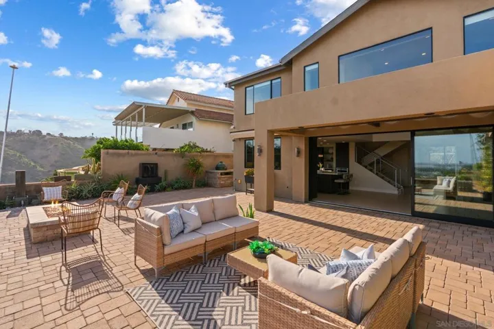 This exceptional contemporary home offers much more than just its impressive views, it truly feels like you are living at a resort.Completely remodeled from the foundation up in 2014, every detail of this permitted renovation blends high-end finishings with a tranquil sophisticated design.Curb appeal begins by walking through an inviting fenced courtyard leading to a welcoming Western Glass Pivot front entry door and sleek frosted glass garage doors.The exterior is engineered for low-maintenance luxury, featuring custom pavers, a dedicated 35’ RV parking space with full hookups, & a sustainable landscape including a butterfly garden & a mini-orchard of Passion Fruit, Dragon Fruit, and citrus trees.Gourmet kitchen with custom Walnut-stained cabinetry with natural quartz slabs,& oversized island. The professional-grade Thermador appliances include a 6-burner gas range with a flat griddle, plus a separate refrigerator and freezer.Enjoy the seamless indoor/outdoor living with panoramic multi-slide glass doors, leading out to the spacious covered patio with the indoor/outdoor fire area a perfect place to watch the Seaworld fireworks. The additional gas fire pit and built-in Big Green Egg BBQ/smoker make entertaining effortless. Sonos sound system downstairs and in the backyard.The backyard is pet friendly with a large designated dog run. Ample storage throughout with custom closet organizers and huge easily accessible walk-in storage room. Primary suite offers vaulted ceilings, soaking tub, impressive walk-in closet , private balcony & an attached multi functional room.
