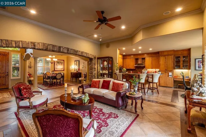 Welcome to 2531 Poppy Dr in Lodi—an elegant single-level home in the sought-after Sunwest Meadow neighborhood. Built in 2005, this 3 bed, 2.5 bath residence blends comfort and style with an open floor plan, spacious rooms, and soaring ceilings throughout. From the moment you enter, you’ll feel the warmth of this thoughtfully designed home. The expansive living room with vaulted ceilings and a stunning stone fireplace flows seamlessly into the chef’s kitchen, featuring granite countertops, stainless steel appliances, custom cabinetry, breakfast bar, and dining area. A formal dining room with vaulted ceilings adds to the inviting layout, while custom flooring beautifully ties together tile and hardwood. The spacious primary suite offers raised ceilings, crown molding, a large walk-in closet, and a luxurious bath with dual vanities, soaking tub, separate shower, and direct backyard access. Two additional bedrooms, 1.5 baths, and a convenient laundry room leading to the 3-car garage complete the interior. Step outside to your private backyard oasis—complete with a pool and spa with waterfall feature, multiple patio areas for lounging, artificial turf, and lush mature landscaping for added privacy. A rare opportunity you won’t want to miss!