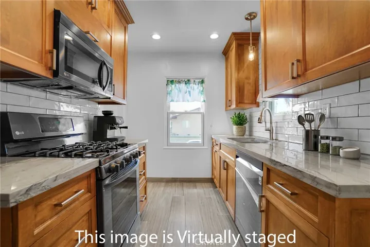 Original character shines throughout—from the arched living room ceiling and built-in linen cabinet to vintage door hardware—preserving the home’s timeless appeal. A 2019 kitchen remodel features custom cabinetry with pull-outs, soft-close drawers, quartz countertops, recessed lighting, a spice cabinet, tile flooring, and an LG appliance package (still under warranty), all opening to a quaint dining area and pantry.