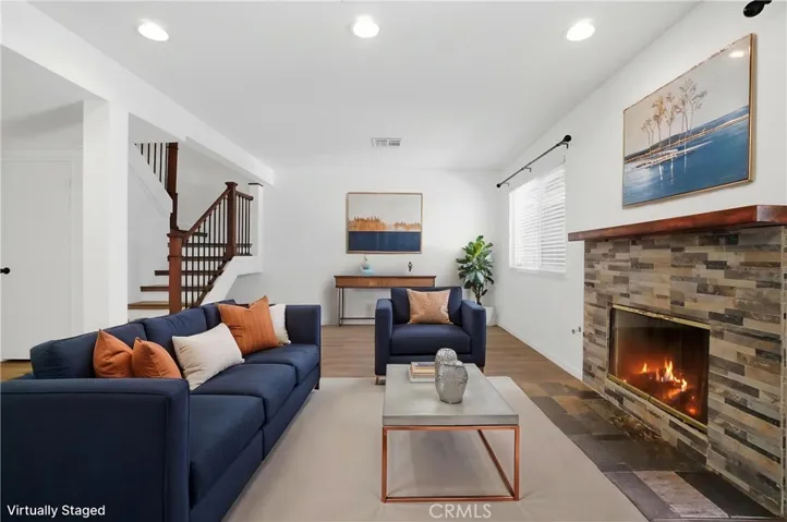 The inviting living room is highlighted by a cozy fireplace, perfect for relaxing evenings at home. Additional features include dual-pane windows, ceiling fans and an in-unit washer and dryer located in a dedicated laundry area downstairs.