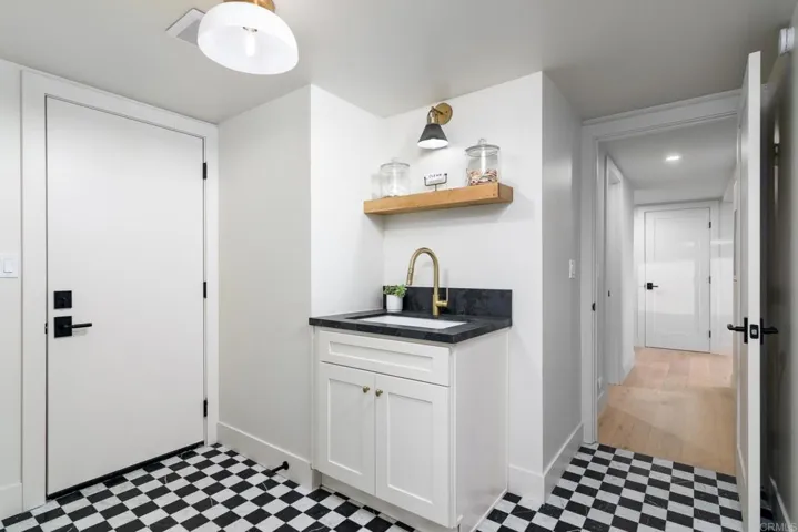 Tucked into a coveted Scripps Ranch corner lot with no neighbors on one side or directly behind, this fully renovated retreat opens to a private nature trail and protected open space—a rare slice of quiet just steps from your door. A grand foyer with iron-railing staircase sets the tone, opening to soaring vaulted wood-beam ceilings, wide-plank engineered hardwood, and a stone fireplace crowned with a striking live-edge wood surround. The chef’s kitchen is pure showstopper: dramatic black quartz with bold white veining, crisp white shaker cabinetry, a glinting gold pot filler, an arched stone range hood, and a professional-grade Forno range made for slow Sunday cooking. The adjoining family room invites lingering with a second fireplace, custom white oak built-ins, shiplap accents, and sliders that pull the outdoors in. Upstairs, the primary suite is its own little hideaway—vaulted ceilings, a third fireplace, and a spa-inspired bath layered in warm oak, honed stone, matte black, globe sconces, a freestanding soaking tub, and a fluted-tile walk-in shower. A deep-blue glossy tile hall bath with walnut vanity and brass pulls adds a jewel-box moment, while a checkered marble laundry room with gold faucet brings charm to the everyday. A main-level bedroom doubles as study or guest retreat. Outside, mature trees, towering palms, and a pergola-shaded patio create a botanical escape. Owned Tesla solar with Powerwall and a three-car garage with epoxy round it all out.