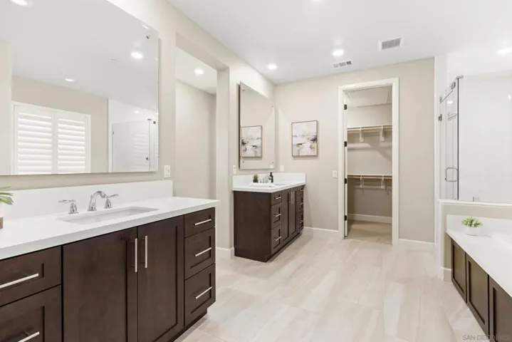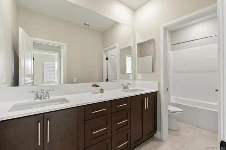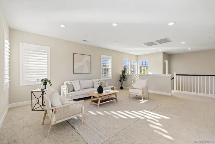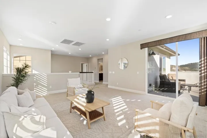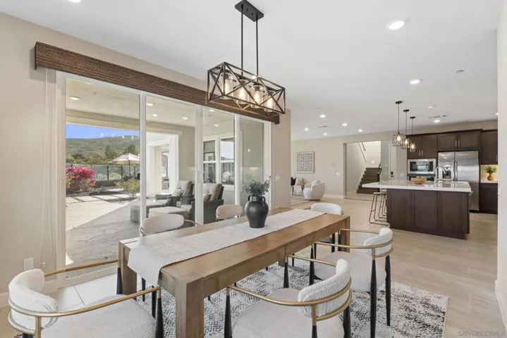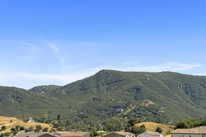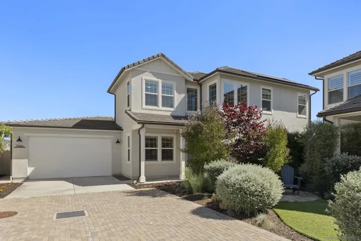 Welcome to refined Southern California living in Harmony Grove Village, where this exceptional residence features OWNED solar, sweeping 180° panoramic mountain views, and true indoor-outdoor resort-style living. Situated on a 0.18-acre lot, this beautifully upgraded home offers 4 bedrooms, 3.5 bathrooms, a dedicated office, and an upstairs loft with a private view balcony. The main-level primary suite is a private retreat with a spa-inspired bath and dual walk-in closets, complemented by a first-floor guest bedroom with full bath—ideal for multigenerational living or guests. The open-concept great room flows into a chef’s kitchen with a large center island, quartz countertops, stainless steel appliances, walk-in pantry, soft-close cabinetry, and designer lighting. Upstairs, secondary bedrooms surround a versatile loft opening to sweeping mountain views. Designed for California living, the wraparound California Room includes a built-in gas fireplace, recessed lighting, and TV wiring for year-round entertaining. The landscaped backyard features low-maintenance paver hardscaping and mature fruit trees. Additional highlights include pre-wired smart home technology throughout, three smart thermostats/HVAC zones, first-floor laundry with utility sink and cabinetry, epoxy-finished 3-car tandem garage, and extended driveway parking. Community amenities include resort-style pool, scenic trails, and playgrounds in a premier master-planned setting