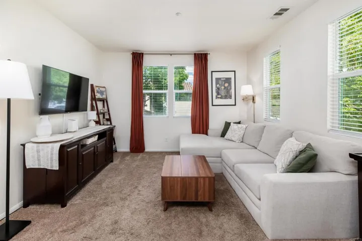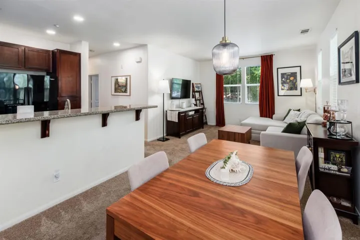 Light, bright, and effortlessly livable—this end-unit townhome in Santa Fe Walk offers the space, storage, and natural light you’ve been looking for. Enter directly from your private 2-car garage into a spacious ground-level entry—the perfect place to drop your belongings at the end of the day—complete with a generous under-stair closet for additional storage. An additional exterior storage closet near the front entry adds even more convenience. Upstairs, the main living area opens up with tall ceilings and abundant natural light, creating an airy, welcoming feel. The open-concept kitchen features granite countertops and flows seamlessly into the living and dining spaces, with a private patio just off the main area—perfect for a breath of fresh air or casual outdoor lounging. The primary suite is a standout, offering a spacious walk-in closet and an en-suite bath with dual sinks. A well-sized secondary bedroom and full bath round out the thoughtful layout. Recent improvements add both comfort and peace of mind, including a new washer/dryer combo, refrigerator, and water heater, along with a replaced ice maker box and updated washer/dryer valves. The garage door opener was replaced in May 2025, and the home has been enhanced with a SimpliSafe security system with doorbell camera, as well as added blinds in the living and dining areas. Enjoy a location that puts you close to it all—just minutes from Downtown Vista’s vibrant, walkable scene filled with local restaurants, breweries, and shops, as well as Vista Village for dining, groceries, and entertainment. You’ll also appreciate easy freeway access, nearby public transit options, and close proximity to the Moonlight Amphitheatre at Brengle Terrace Park for year-round events and shows—all while being just a short drive from the coast.