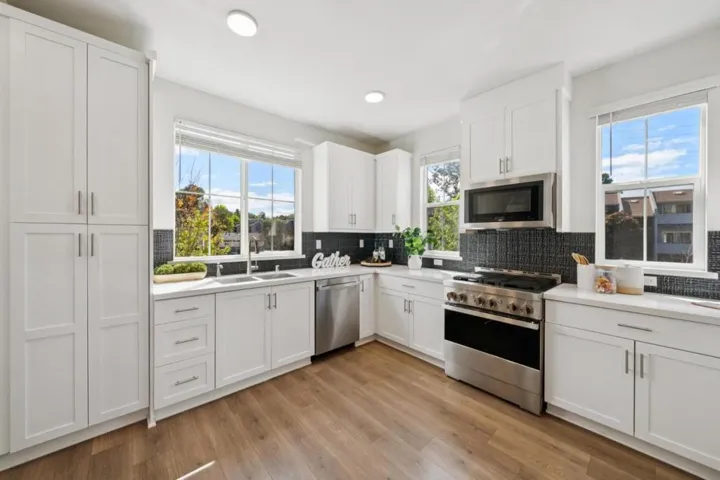 Welcome to 663 Alamo Ct, built 2021, this stylish 3-bedroom, 2.5-bath townhome in Mountain View offering 1,439 sq ft of modern living. Featuring LVP flooring in the main living areas, Multi Zone Central A/C, and a Bright open layout, this home is Designed for Comfort and Convenience. The kitchen boasts Quartz Countertops, Tiled Backsplash, and S/S appliances including LG and JennAir. Spacious Family room opens to a Large Private Balcony, perfect for Relaxing or Entertaining. Upstairs, the Primary suite includes a Walk-in Closet and a Sleek en-suite Bathroom. Two additional bedrooms, a Full Bath, and in-unit Laundry complete the Upper Level. Additional highlights include an Attached 2 Car Side by Side Garage with EV charger, Extra storage, and HOA amenities covering exterior maintenance, BBQ area, and playground. Ideally located near Castro Street, Whisman & Shoreline Park, major Tech campuses like Google, Microsoft and LinkedIn, and Top Schools including Mountain View High School, with Easy access to Highways 101, 85, Central Expressway and Caltrain, Trails & Bike Routes