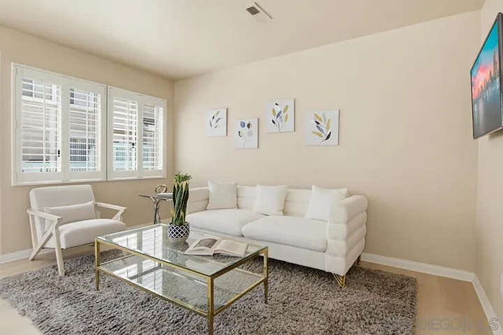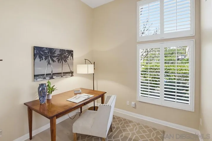 Welcome home to this bright end-unit in the highly coveted Camellia Valley Halcyon community! This 1,604 sq. ft. townhome combines a functional layout with an airy, open feel, highlighted by soaring high ceilings and expansive windows that fill the home with natural light from three sides. The home offers flexible living with a full bedroom and bathroom on the entry level, ideal for a home office, guest suite, or multi-generational living. The kitchen features a brand-new stainless-steel gas range and a high-performance hood with external exhaust, perfect for cooking enthusiasts. Throughout the home, you’ll find luxury vinyl flooring and plantation shutters that add both style and practicality. An oversized patio off the dining area creates a seamless indoor-outdoor flow, ideal for BBQs and entertaining. The spacious primary suite serves as a true retreat with dramatic high ceilings, enhancing its open and relaxing feel. An attached 2-car garage provides convenience along with additional storage space. Located in a prime San Diego pocket, you’re just minutes from parks, shopping, and top-tier education, with assignment to highly rated schools including Carmel Creek Elementary School right across the street. Clean, well-maintained, and attractively priced, this home presents a rare opportunity to move into a premier neighborhood and make it your own.
