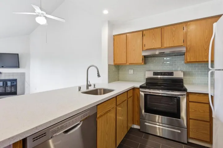 Set in the gated Adobe Hills community, this bright 1-bedroom, 1-bath condo offers privacy, vaulted ceilings, and an open living area with a fireplace. A private balcony overlooks the communitys peaceful, landscaped grounds. The kitchen features recessed lighting, sleek countertops, ample cabinetry, and flows into the living and dining areas. The bedroom is filled with natural light, and the bathroom includes a shower-over-tub and wide vanity. An in-unit washer and dryer, plus built-in shelving, add convenience. Additional features include a deeded parking space and storage unit. Residents enjoy a pool, tennis courts, a clubhouse, elevators, and beautifully maintained grounds. Conveniently located near Central Park, Lake Elizabeth, shopping, dining, trails, and major highways, this home also offers easy access to BART 10 mins walk and the rest of the Bay Area.
