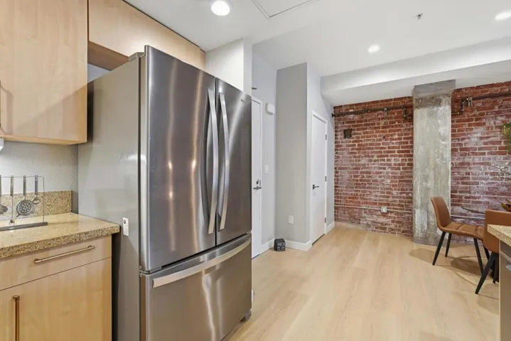 Brick-and-Beam stylish first floor, one level easy living in this thoughtfully updated one bedroom, one bathroom home centrally located by the elevator, lounge, and gym. Featuring striking industrial beams and original brick walls, the space blends character and comfort seamlessly flowing with brand new Cedar LVP flooring throughout the home. Mid mod lighting and brushed bronze hardware add touches of elegance. The kitchen is upgraded with SS appliances including a striking new induction range and new dishwasher, offering both efficiency and modern appeal. Enjoy a full suite of amenities including a BBQ area, fire pits, dog run, bamboo groves, bike lockers with work bench, conference room, Amazon lockers, community storage, and EV charging. Ideally situated near Diridon train station, Whole Foods, Cahill Park, SAP Centre, and the tech corridor with easy access to highways 880, 87, and 280, this home delivers convenience, style, and an active luxurious urban lifestyle.