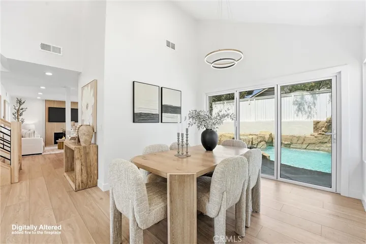 The main level offers an open-concept layout with a spacious living room, dining area, breakfast nook, and Sliding and folding doors open to the backyard oasis. Upstairs, you’ll find three bedrooms, including a luxurious primary suite with a walk-in closet and dual-sink vanity. The front yard features fresh landscaping and lush greenery with an iron gates, while the backyard is a true retreat, with new landscaping, a gazebo, pool, spa, fountain, and slide.