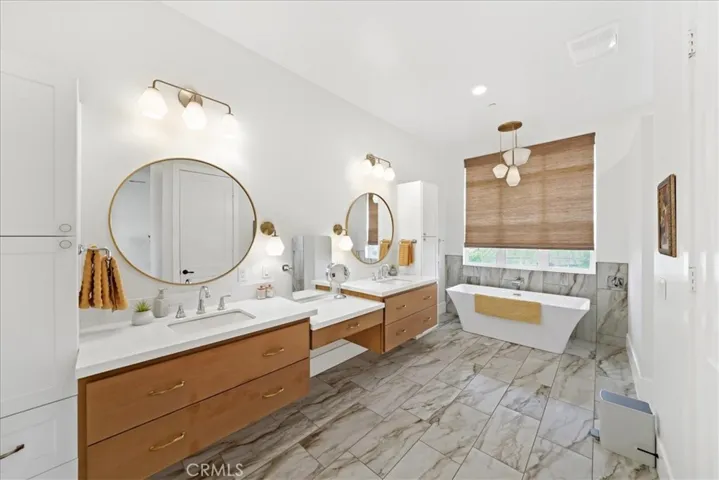 Twenty owned solar panels with Enphase micro inverters warranted through 2048 eliminate the electric bill. Smart home controls run climate, irrigation, nine-camera security, fans, and garage doors. Four-car-plus garage with tandem depth and rear pass-through to the yard. Dedicated RV area with full hookups including high-voltage electrical, water, and sewage. Over 590 SF of covered patio and California room wrap nearly the full length of the home with copper lantern chandeliers and six smart fans. The property is a producing farm with 23 fruit trees, including avocado, mango, citrus, stone fruit, fig, olive, and pomegranate, raised beds with dedicated irrigation, and acreage for chickens or livestock. Pre-plumbed with dedicated water line and separate electrical for a future ADU, designed for independent utility metering so a guest house or rental carries its own accounts from day one. No HOA. Tax rate 1.02%