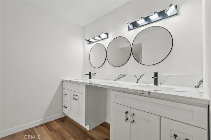 The spacious living room features a beautiful focal-point fireplace with custom tile work and a rustic wood mantel. Large sliding doors lead to private outdoor spaces, inviting an abundance of natural light. The primary suite offers a massive double vanity with triple circular mirrors and designer lighting, providing a true retreat experience.
