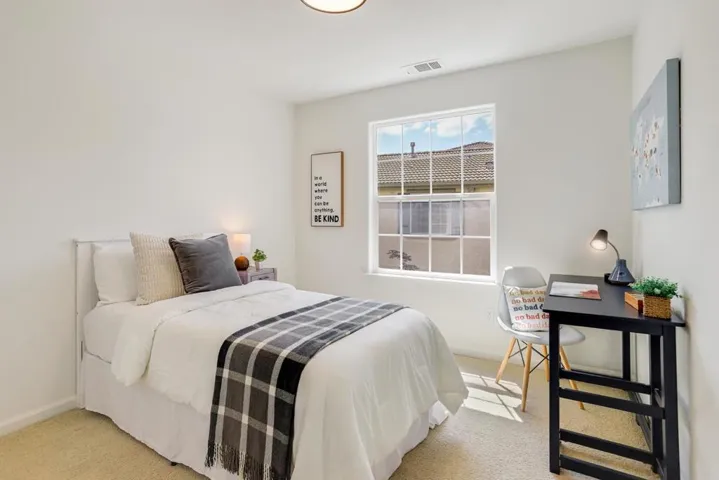 CUPERTINO SCHOOLS. This stunning contemporary residence welcomes you with soaring pitched ceilings and an abundance of natural light. The grand entryway leads into a sophisticated open-concept living area. Rich hardwood floors, and recessed LED lighting run throughout the main level, where a spacious living room centered around a striking gas fireplace flows seamlessly into the gourmet kitchen and dedicated dining area. The kitchen is a chefs dream, boasting wood shaker cabinets, elegant quartz countertops with full backsplash, stainless steel appliances, and a large peninsula with seating. For effortless indoor-outdoor living, the dining area opens to a spacious private patio featuring elegant pavers. The upper level features a versatile open loft area perfect for a home office. The expansive master suite serves as a private sanctuary, offering a large walk-in closet and a spa-like bathroom with dual vanities, a soaking tub, and a separate walk-in shower. Three additional bedrooms and a laundry area and complete the top floor. Amenities include a half bath, dual-pane windows, central forced heating and cooling, tankless water heater and an attached two-car garage with automatic opener. This home is perfectly situated for easy access to major expressways and premier tech hubs.