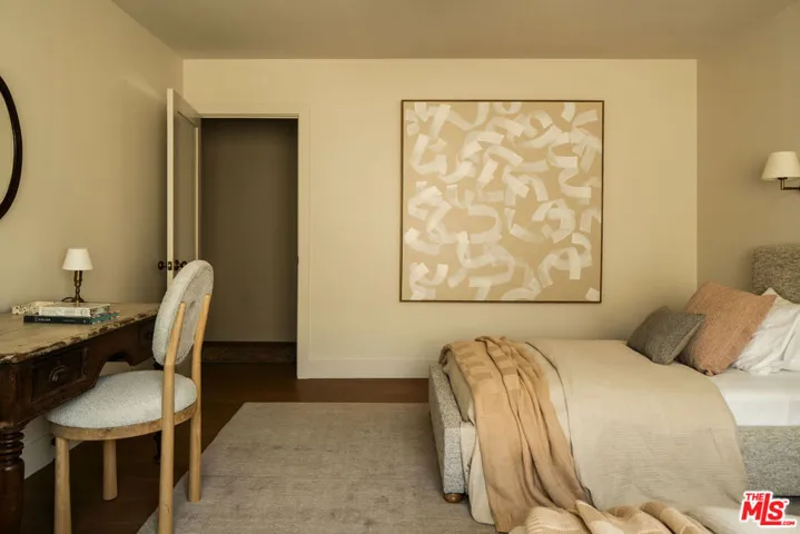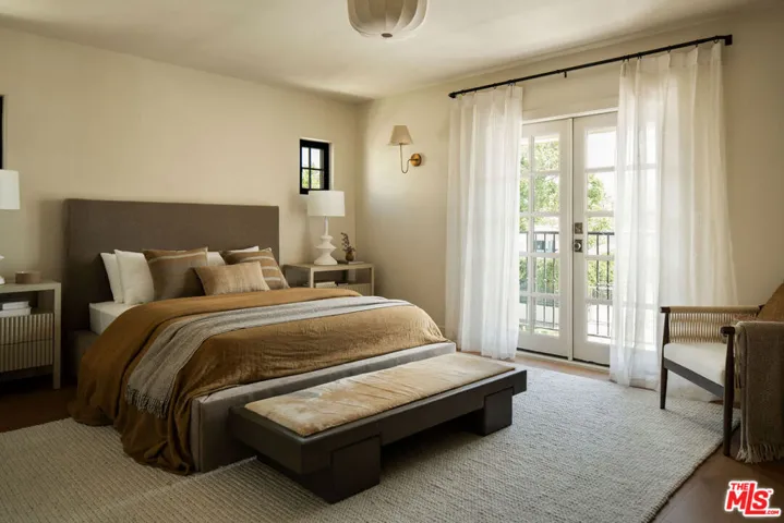 The curb appeal of this newly renovated Spanish home in Sycamore Square sets an exceptional first impressionand the rest of the property more than delivers. Thoughtfully reimagined by Jaime Morse of Morse Design at a level of fine luxury, every detail has been carefully curated. The exterior showcases smooth stucco, refined drought-tolerant landscaping, travertine pavers, and elegant landscape lighting, all anchored by a striking sixty-year-old olive tree evoking the charm of a Mediterranean retreat. Multiple gated entry points provide both privacy and a sense of exclusivity.Inside, an expansive foyer welcomes you with an elegant curved staircase, a stunning powder room finished in lime-washed paint, and a seamless open floor plan that flows through the spacious main level. Hennessy white oak floors run throughout, complemented by custom, hand-selected lighting fixtures sourced from around the world.The nearly 40-foot-long kitchen is a true centerpiece, appointed with Sub-Zero, Thermador, and JennAir appliances. Brass hardware and warm paint tones pair beautifully with Calacatta Caldia marble countertops and backsplash. A dramatic center island, measuring over 13 feet, offers ample space for both food preparation and dining. The kitchen opens to a generous living room, where a fireplace serves as the focal point, and soft afternoon light pours through west-facing French doors and windows. This five-bedroom home features four bedrooms upstairs, each enhanced with custom fixtures and built-in closets. The primary suite is a private retreat, featuring Portola lime-wash paint, a walk-in closet, and a spacious bathroom with Aero Cream marble shower tile. An upstairs family room provides additional space for relaxation or play.The reimagined backyard is designed for both entertaining and tranquility, featuring a heated pool and spa, lush grass, and tall ficus trees for privacy. A well-appointed pool house includes a covered open-air lounge area, along with an enclosed space ideal for a gym or art studio.This exceptional renovation offers a refined living experience that will appeal to the most discerning buyer.The permitted Pool House/Rec Room at 579 square feet is in addition to the square footage of the main house at 4,400 square feet per plans. Includes enclosed and covered space.