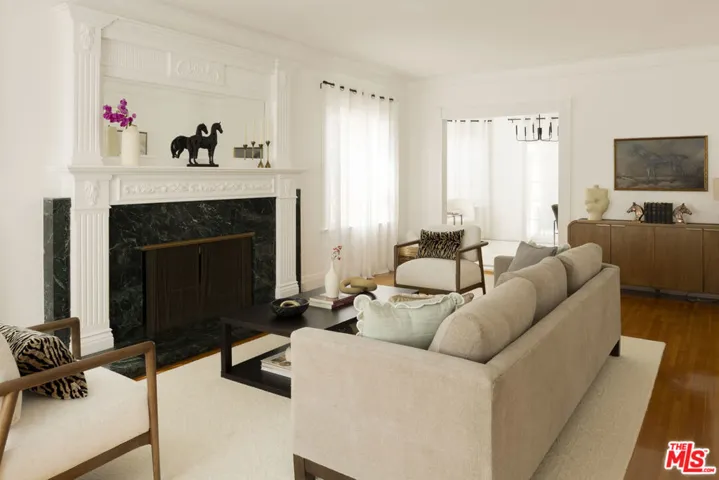 Commanding a premier corner presence in the heart of Windsor Square, this distinguished 1919 Colonial estate is a rare offering, gracefully held and meticulously cared for by the same family for nearly three decades. Rich in heritage and architectural integrity, the residence unfolds across a grand yet balanced floor plan, offering 4 bedrooms and 3 1/4 baths infused with timeless sophistication, with subtle Art Deco influences and a sense of effortless flow throughout. A stately double-door entry introduces a dramatic foyer, setting the tone for interiors defined by scale, light, and enduring elegance. A formal parlor with French doors and an expansive living room anchored by a classic fireplace create a seamless interplay between refined entertaining and relaxed living. Lustrous hardwood floors and a sweeping central hall guide you to a striking dining room designed for memorable gatherings, effortlessly extending to the outdoors. Beyond, a secluded, fully gated garden sanctuary evokes a private, resort-like atmosphere complete with a pergola, spa, curated drought-tolerant landscaping, and multiple areas for elevated al fresco dining in the glorious Southern California climate. The kitchen and adjoining laundry are thoughtfully positioned just off the dining room, while a versatile main-level bedroom, currently styled as an office, offers flexibility for guests or work-from-home living. A well-appointed guest bathroom completes the main level. Ascend a gracious staircase to the second level, where three spacious bedrooms await. The luminous primary suite serves as a true retreat, featuring an en suite bath with soaking tub, ample closet space, and two additional nooks ideal for a nursery, yoga room, or private office. One of the secondary bedrooms boasts a charming, enclosed sun porch, adding warmth and character. A refined guest bathroom completes the upper level. A detached two-car garage with impressive ceiling height offers a rare bonus: a substantial upper-level space ideal for a studio, creative workspace, or potential ADU conversion (buyer to verify). Enhancements include a newer roof, central HVAC, retrofitted foundation, partial sewer line replacement, upgraded copper plumbing, and a 200-amp electrical panel, blending classic architecture with modern infrastructure. Privately hedged and gated, and moments from Larchmont Village and the prestigious enclaves of Hancock Park, this exceptional residence is also ideally positioned near some of the area’s most highly regarded schools, further enhancing its appeal. This exceptional residence represents a rare opportunity to own a legacy property in one of Los Angeles’ most storied neighborhoods – one that truly must be experienced in person to appreciate its energy and flow.