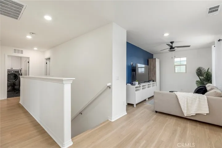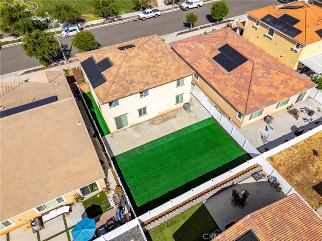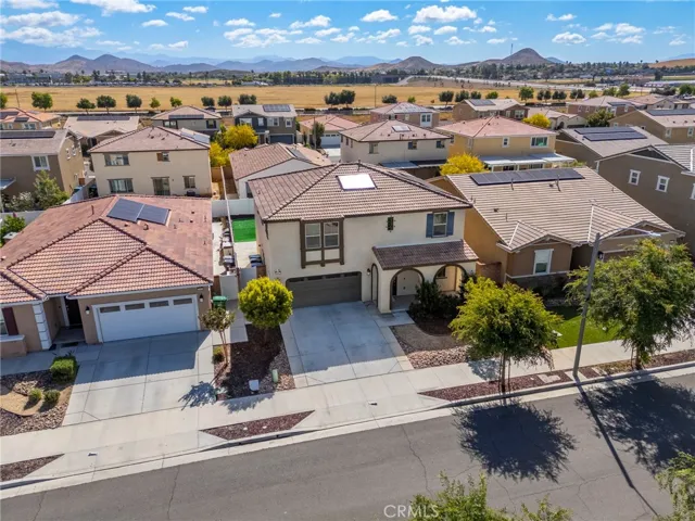 Built in 2021 and featuring fully Owned Solar, this stunning newer construction home offers the epitome of California living in the heart of Menifee! The spacious 2,400-square-foot floor plan includes four bedrooms (with a convenient guest room on the main level), three bathrooms and beautiful luxury vinyl plank flooring. Step inside to find a bright, open-concept living and dining space centered by a gourmet kitchen featuring white shaker cabinets, granite countertops, custom pendant lighting, and a large island with seating for four. The upper level hosts a versatile loft and three additional bedrooms, including a primary suite complete with an en-suite bathroom, dual walk-in closets, and double vanities. Upstairs bathrooms and laundry room feature modern updated tile. The kitchen refrigerator, washer/dryer, security system, and drinking water filtration system are all included! Practicality meets style with a dedicated laundry room full of storage shelving, while the expansive backyard and large patio provide the perfect setting for entertaining. As part of the vibrant Menifee Town Center community, residents enjoy resort-like amenities including a clubhouse, pool, dog park, and bike trails, all for a low HOA fee. With a pristine park right across the street and the shopping and dining of Menifee Countryside Marketplace within short walking distance, this is a rare opportunity that you must see in person!