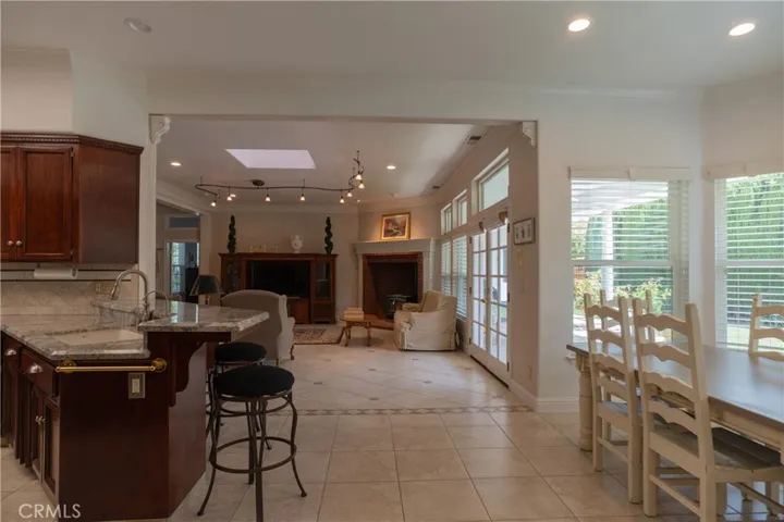 seamless flow into the gourmet kitchen featuring rich custom cabinetry, Viking range and hood, abundant
