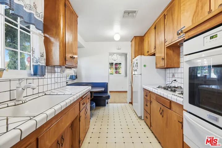 Character, warmth and California living exude from this classic bungalow. Beautiful brick detailing, picturesque porch, rose bushes and spacious, grassy front yard offer immediate curb appeal. Enter into a comfortable living room with a focal point fireplace. Just off the living room is a nicely sized dining area, ideal for family dinners and entertaining. Perfectly situated off the dining room is the kitchen with plenty of counter space and built-in breakfast nook. Two bedrooms share a nicely sized full bathroom with original detailing. The third bedroom has direct access to a powder room and can be entered off the kitchen making it a perfect space for an office or flex room. Exit to the backyard which features a stunning mature tangerine tree, the perfect backdrop for al fresco dining and warm summer evenings spent outside with friends and family. A tiled patio and detached garage complete the outdoor space. This home has been lovingly maintained and is ready to move in while also offering an abundance of opportunity inside and out to customize and create your dream home.