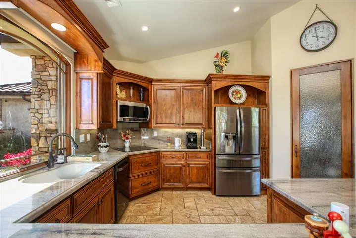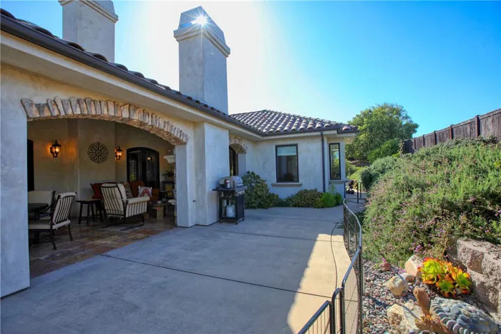 he heart of the home opens through custom 9-pane Andersen French doors to a spectacular 14’ x 28’ covered patio—an entertainer’s dream—complete with travertine floors, a gas-insert fireplace, and elegant arch-topped openings. A private, walled front courtyard offers an additional serene outdoor retreat.