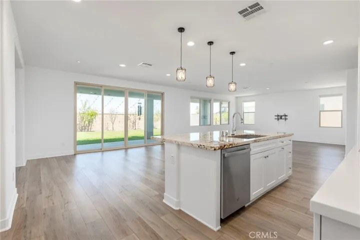 Built in 2021, this stunning Tri Pointe Home sits on a spacious 8,712 square foot cul-de-sac lot with no rear neighbors and beautiful views! The popular Magnolia floor plan features five bedrooms, including a convenient guest suite on the main level, three bathrooms PLUS a flex room adjacent to the kitchen PLUS an upstairs loft. Upon entering through the charming covered porch, you are greeted by a grand two-story entryway with an open rail staircase. The main level continues into an expansive great room with Luxury Vinyl Plank flooring and a 12-foot center-open sliding glass door that seamlessly blends indoor and outdoor living. The gourmet kitchen is a chef’s dream, boasting white shaker-style cabinetry, gorgeous custom granite and quartz countertops, and a large island with seating for three. Stainless steel appliances, an undermount single-basin sink, and elegant pendant lighting complete the space. Tucked just off the kitchen is a versatile flex room perfect for a home office or playroom. The second level offers a spacious loft situated near the primary bedroom suite, which overlooks breathtaking mountain views. The primary en suite bathroom provides a spa-like experience with two separate vanities, custom tile flooring, a walk-in shower with a seat, and a generous walk-in closet. Three additional bedrooms, a third full bathroom, and a dedicated laundry room with a sink and storage shelves are located down the hall. High-tech upgrades are found throughout the home including motorized smart blinds, a tankless hot water heater, LED lighting, Whole House Fan and fully OWNED SOLAR panels. Outdoor living is elevated by a double-length balcony that provides significant shade for the backyard patio below. The yard offers multiple areas for seating or lawn games, along with ample room to build a custom pool. Living in Spencer’s Crossing grants access to world-class amenities including three resort-style pools, a spa, sports parks, scenic walking trails, and a clubhouse. This home is located near top-rated schools, premier shopping including the new Costco, upscale dining, and the 215 freeway. Come see this exceptional property today!