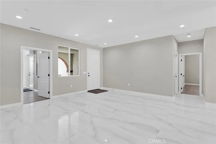 Step inside to a bright and expansive open floor plan highlighted by high ceilings, recessed lighting, and elegant finishes throughout. The spacious living and dining areas flow effortlessly into a beautifully designed kitchen, complete with sleek white cabinetry, quartz countertops, stainless steel appliances, and a large center island with striking contrasting cabinetry, ideal for both everyday living and entertaining.