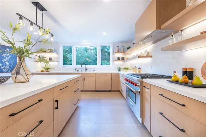 Set on nearly half an acre, this completely redesigned Spanish Transitional estate blends timeless architecture with modern luxury living. The grounds set the tone of the residence as a true resort-style sanctuary designed for year-round California living. A championship-style pickleball court anchors the recreational amenities while a gated pool and spa shimmer at the center of the landscape. Expansive brick-lined terraces, a pergola-covered lounge area, and generous stretches of manicured lawn create distinct zones for entertaining, unwinding, and gathering under open skies. This is outdoor living elevated into a private estate experience. Inside, soaring beamed and cathedral ceilings, wide-plank wood flooring, and bespoke architectural detailing set a tone of understated sophistication. Walls of glass and multiple sets of French doors dissolve the boundary between indoors and out, flooding the home with natural light and constant connection to the resort-like exterior. The chef’s kitchen is a statement in both form and function, anchored by a generous island with seating, stone surfaces, soft-close cabinetry, and premium appliances, including a 6-burner Wolf range and ovens. The adjoining family room is designed for elevated entertaining with a custom wet bar and integrated wine fridge, while the formal dining room offers a refined setting framed by designer lighting and tranquil views. Five en-suite bedrooms provide exceptional privacy and scale, including a spectacular primary suite that rivals a five-star resort. A fireplace, dual French doors to a private balcony, and a fully customized walk-in closet with its own wine fridge define the experience. The spa-inspired bath is pure indulgence, featuring a soaking tub, dual-person rain shower with integrated seating, dual vanities, a private water closet, and a second secluded balcony retreat. Located within the coveted Lanai School District and close to both Ventura Boulevard and the Westside, this is a rare offering where lifestyle, architecture, and location converge, created for those who expect nothing less than exceptional.