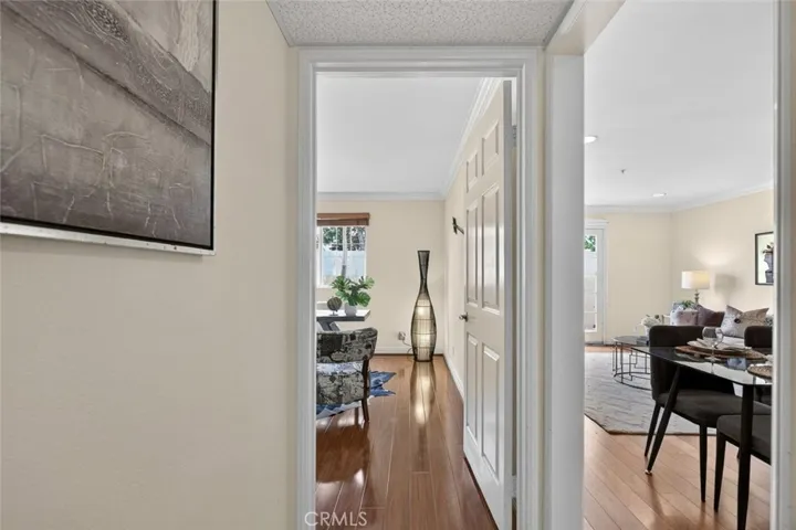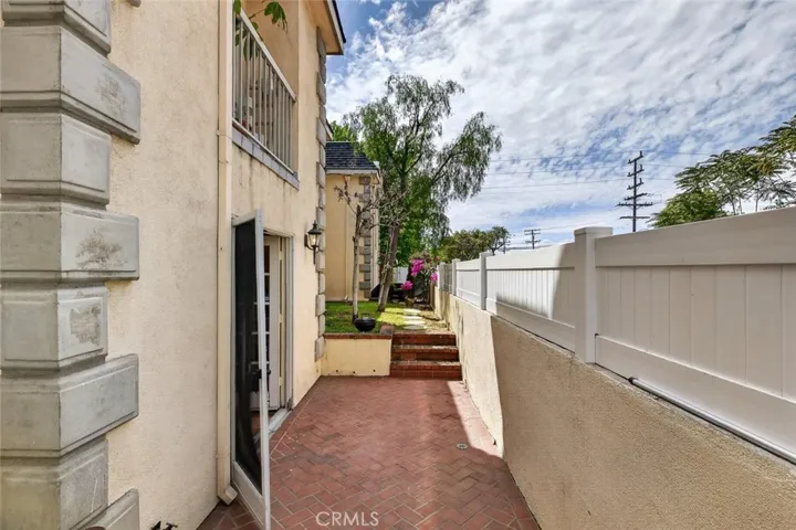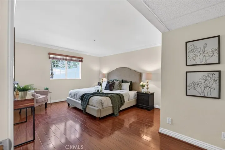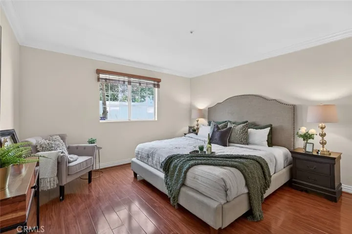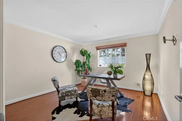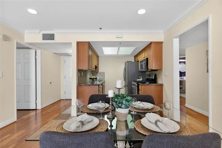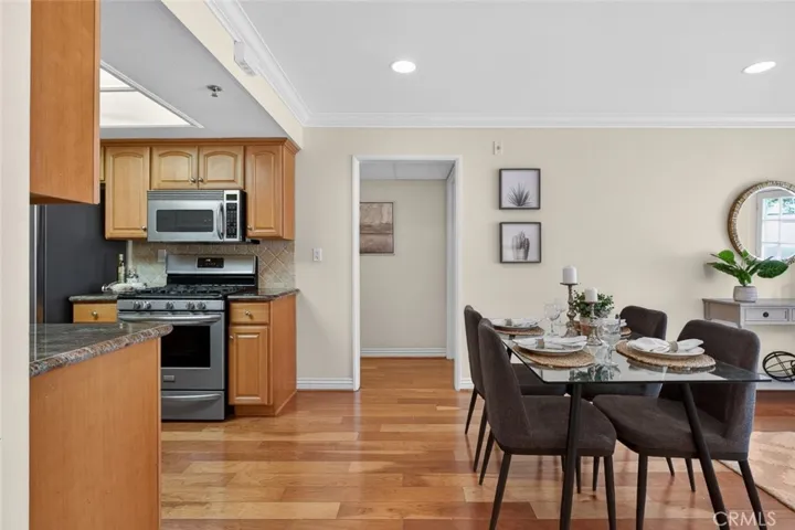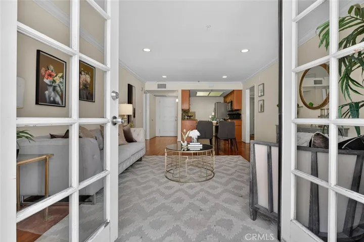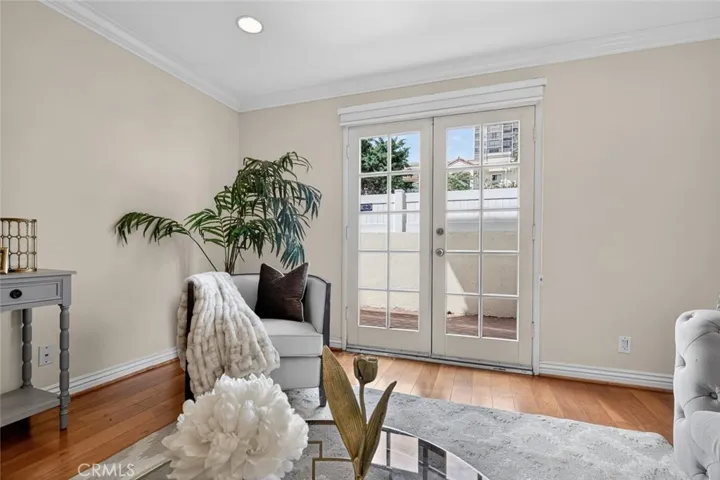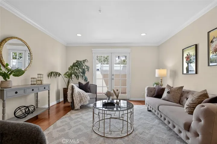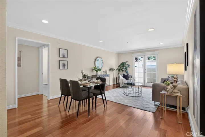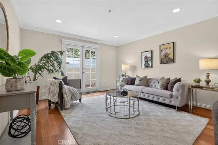 The interior features warm wood flooring, elegant crown molding, and recessed lighting, creating a refined yet inviting atmosphere. The living and dining areas flow effortlessly into the well-appointed kitchen, complete with granite countertops, ample cabinetry, and stainless steel appliances. Striking French doors from the living room open to a charming private patio, creating a seamless indoor-outdoor extension perfect for relaxing or entertaining.
