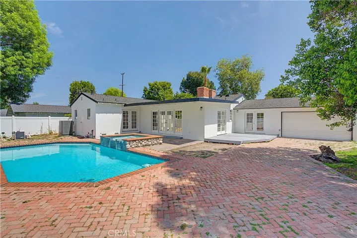 5733 Oakdale Ave. in Woodland Hills, located on the iconic Candy Cane Lane, is a beautifully renovated 3-bed + 2-bath home offering 1,994 sq. ft. of living space on an expansive 17,788 sq. ft. flat lot. A circular-style driveway with dual access points runs parallel to the home and connects to a secondary drive leading to a pull-through garage, providing ample off-street parking and easy access. Mature landscaping and a private entry gate open to a brick pathway that guides you to the front door. Inside, the entry opens to the first of three living areas, featuring refinished hardwood floors and a classic brick fireplace. This space opens into the renovated kitchen, complete with stainless steel appliances, brand new custom cabinetry, quartz countertops and a breakfast nook. An archway opens to the second living area, ideal as a formal dining room or entertaining space, highlighted by a wall of windows along a curved wall. French doors open from this room to the backyard patio. A third living area offers an additional brick fireplace and two sets of French doors, creating a strong indoor-outdoor connection. Hardwood floors continue into the primary suite, which includes a walk-in closet, an upgraded en suite bathroom with a quartz-top vanity, and its own set of French doors leading to the backyard. Two additional bedrooms also feature hardwood flooring and share a updated bathroom with a double-sink quartz vanity. A separate laundry room adds convenience. The backyard is divided into two distinct areas. The first boasts a patio, pool, jacuzzi and easy access to the pass-through garage. The second offers a large, flat section ready to be transformed into a garden, additional outdoor living space, or something entirely custom. Two storage sheds provide added utility, and the pull-through garage includes additional laundry hookups. Nearby attractions include Westfield Topanga & The Village, Warner Center Park, Serrania Park, Woodland Hills Country Club and all the restaurants and shops available along Ventura Blvd. Some photos have been virtually staged. Trust Sale.