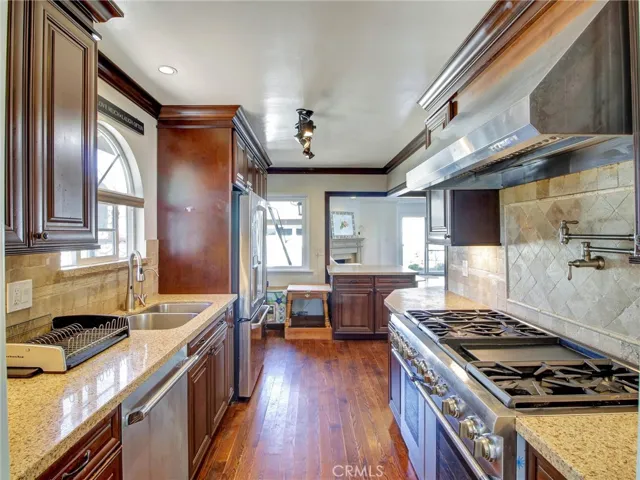 The fully remodeled kitchen is designed for modern living, showcasing premium Thermador appliances, quartz countertops, under-cabinet lighting, self-closing cabinetry, and a skylight that fills the space with natural light. A breakfast bar and center island open seamlessly into the spacious family room, highlighted by a limestone fireplace and sliding glass doors leading to the backyard.